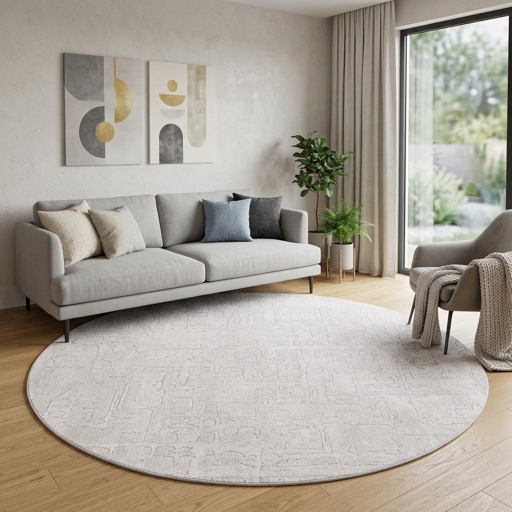 This 8-foot white round abstract non skid area rug, is a great way to add warmth to a room. This geometric round shaped rug features a abstract pattern in white that combines a good looking print with a unique and updated shape. The mix of shape, color, and design gives this rug refreshing visual interest. This larger sized rug is ideal to create a focal point or statement piece in your room. 84-inch h x 84-inch w x 0.2-inch d
