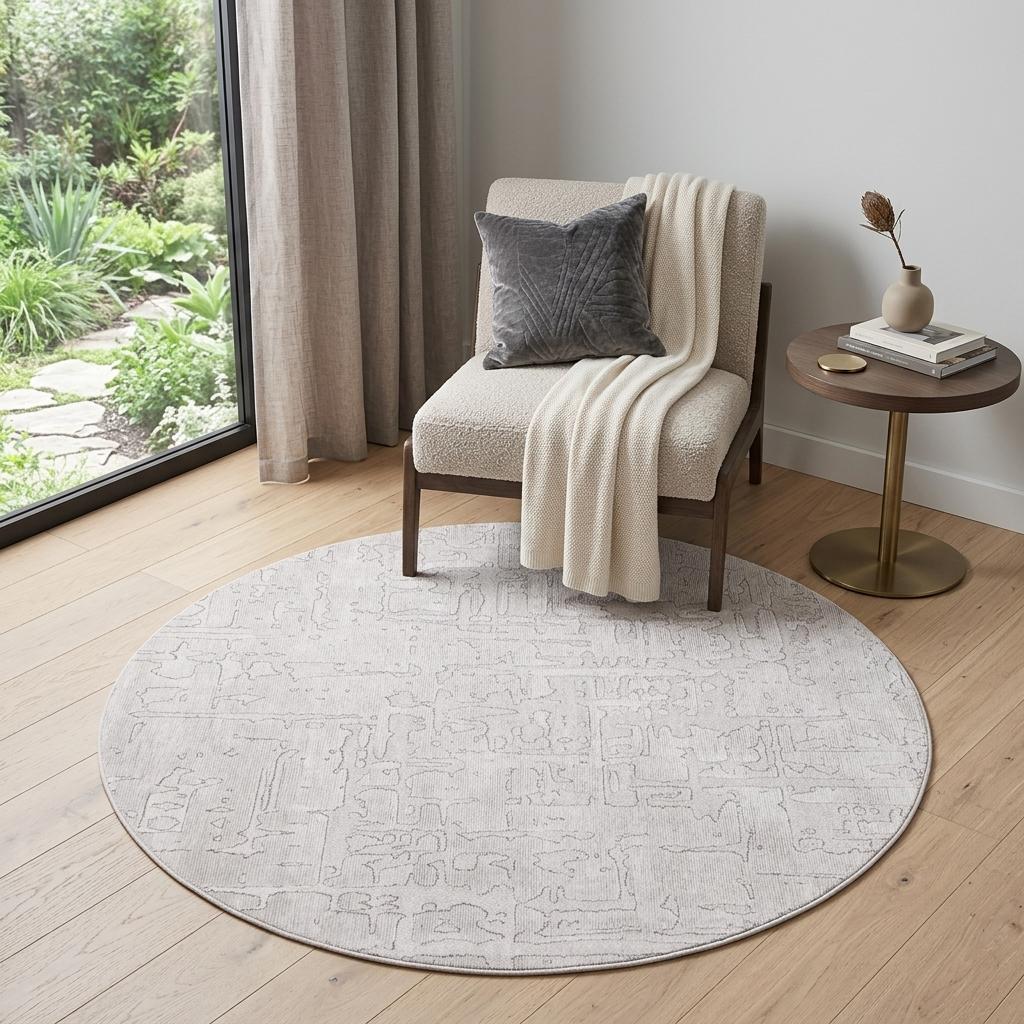 Set an inviting tone in your space with this 5-foot white round abstract non skid area rug. This geometric round shaped rug features a abstract pattern in white that combines a good looking print with a unique and updated shape. The mix of shape, color, and design gives this rug refreshing visual interest. This smaller sized rug is just what you need for your walkway, or in front of door, cabinet, refrigerator, or chair. 48-inch h x 48-inch w x 0.2-inch d