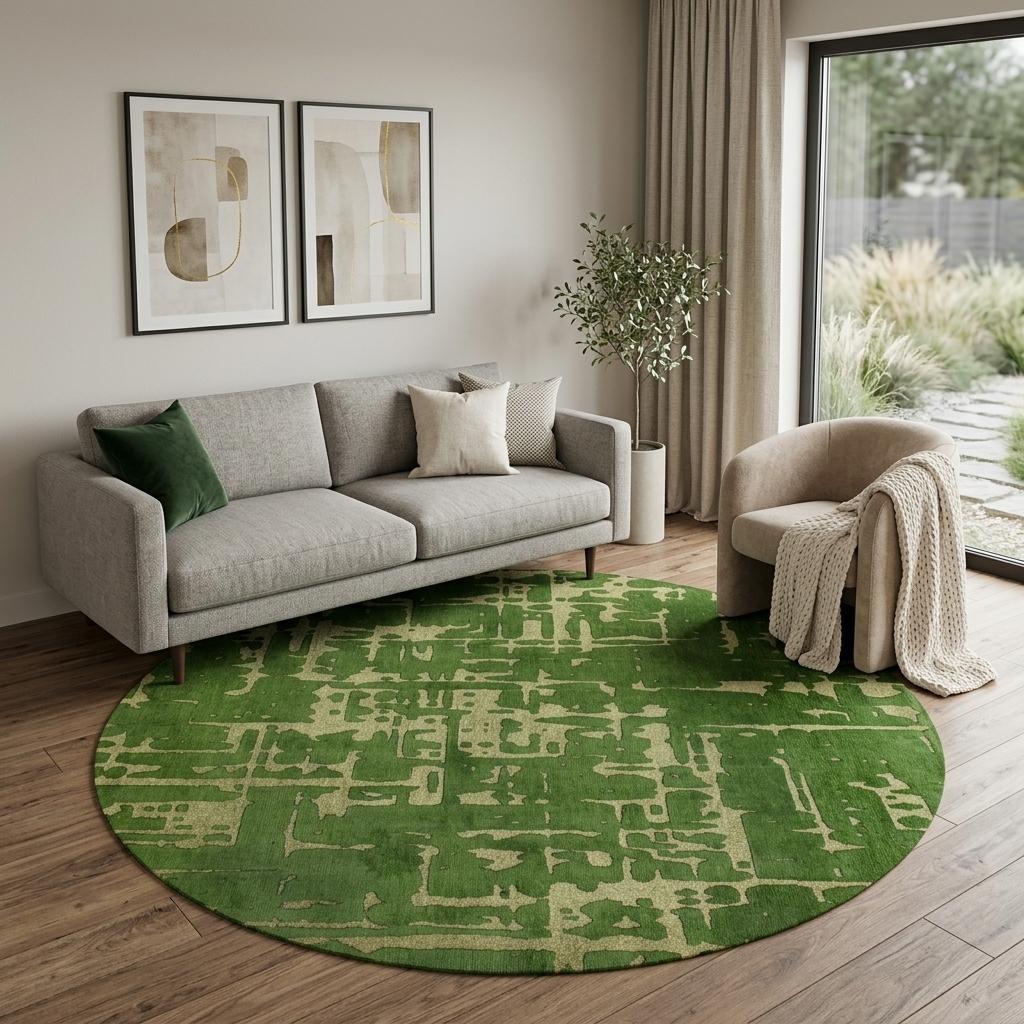 Add great coloration and comfortable texture to your space with this 8-foot green round abstract non skid area rug. This geometric round shaped rug features a abstract pattern in green that combines a good looking print with a unique and updated shape. The mix of shape, color, and design gives this rug refreshing visual interest. This larger sized rug is ideal to create a focal point or statement piece in your room. 84-inch h x 84-inch w x 0.2-inch d