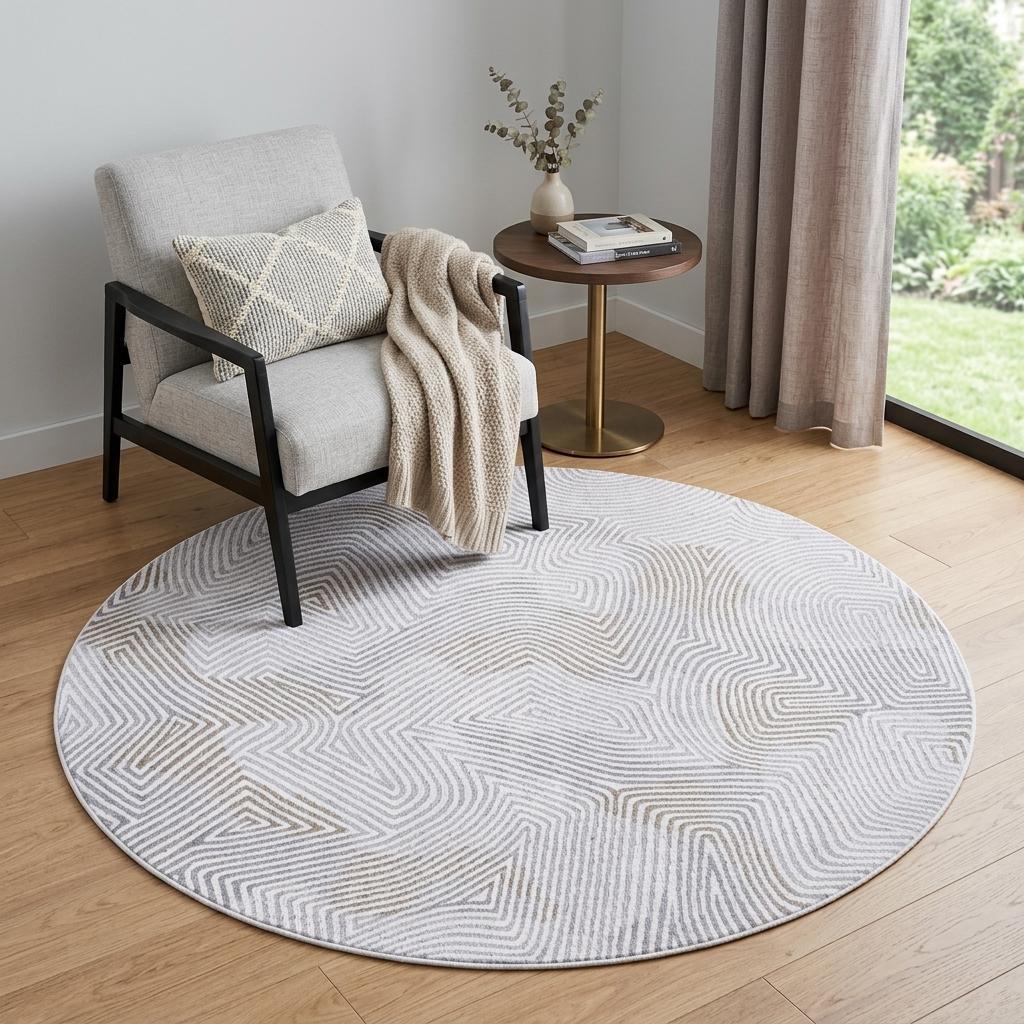 Add some artistry to your room with this 5-foot white round abstract non skid area rug. This geometric round shaped rug features a abstract pattern in white that combines a good looking print with a unique and updated shape. The mix of shape, color, and design gives this rug refreshing visual interest. This smaller sized rug is just what you need for your walkway, or in front of door, cabinet, refrigerator, or chair. 48-inch h x 48-inch w x 0.2-inch d