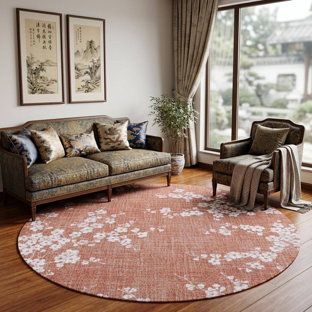 Set an inviting tone in your space with this 8-foot red and white round oriental non skid area rug. This geometric round shaped rug features a oriental pattern in red and white that combines a good looking print with a unique and updated shape. The mix of shape, color, and design gives this rug refreshing visual interest. This larger sized rug is ideal to create a focal point or statement piece in your room. 84-inch h x 84-inch w x 0.12-inch d