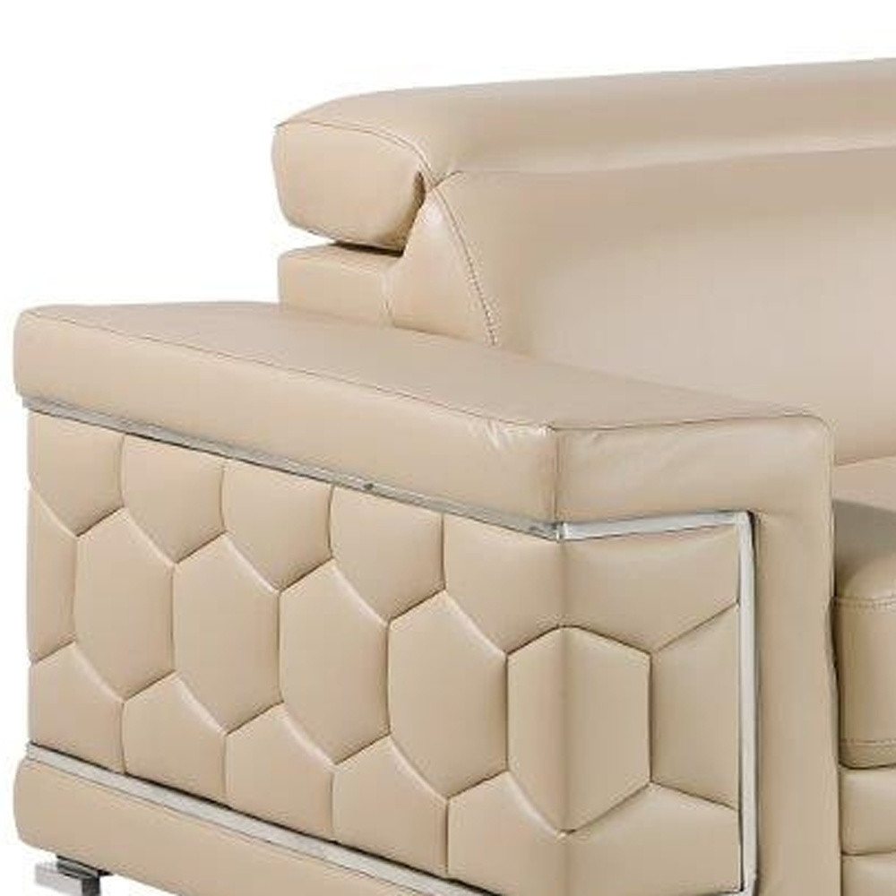 Step into a world of unparalleled seating comfort with our remarkable two piece indoor beige genuine leather five person seating set. Upholstered in supple and luxurious genuine leather, this set has a rich and warm appeal. Solid or two-tone colorations allow you to blend easily with most any decor. The presence of sinuous springs seat construction helps distribute weight evenly, reducing pressure points. The inclusion of a loveseat into your mix allows a fashionable seating option in a compact design. 29-inch H x 89-inch W x 41-inch D
