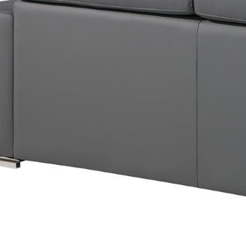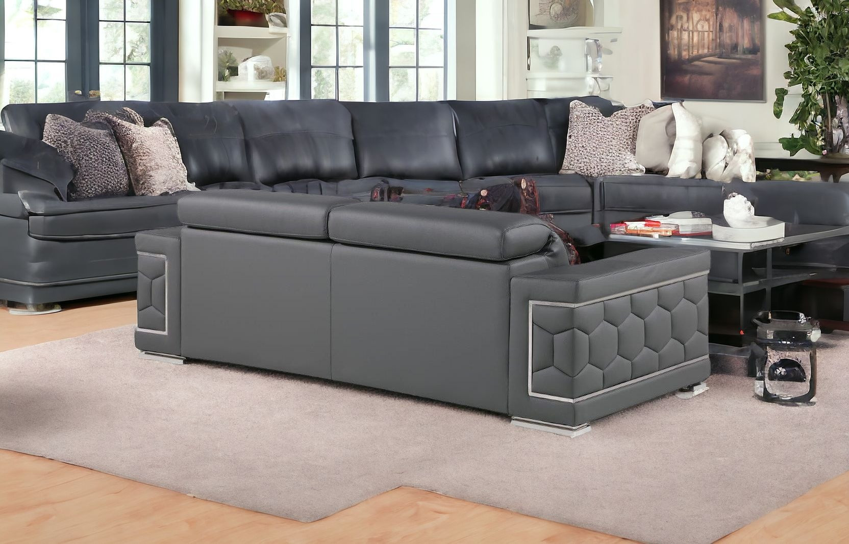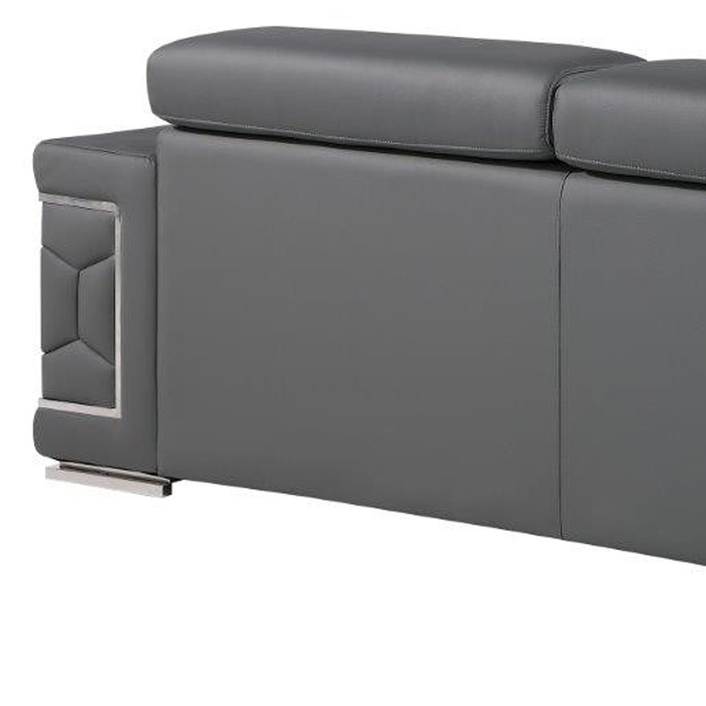 Step into a world of unparalleled seating comfort with our remarkable two piece gray genuine leather five person seating set. Upholstered in supple and luxurious genuine leather, this set has a rich and warm appeal. Solid or two-tone colorations allow you to blend easily with most any decor. The presence of sinuous springs seat construction helps distribute weight evenly, reducing pressure points. The inclusion of a loveseat into your mix allows a fashionable seating option in a compact design. 29-inch h x 89-inch w x 41-inch d.