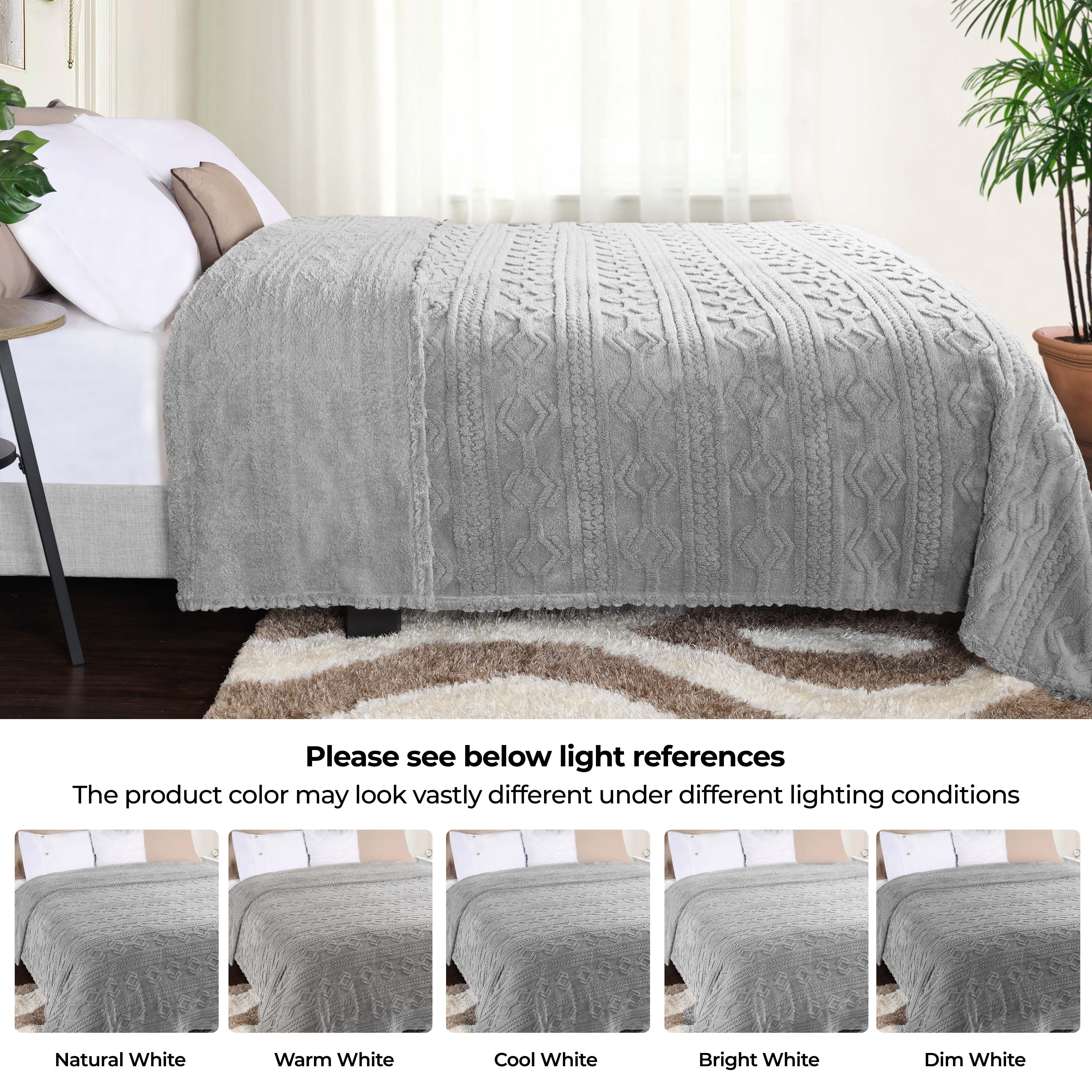 This king platinum fleece knitted plush blanket is a cozy and stylish addition to your bed ensemble. Super soft, and featuring timeless style, this fleece blanket offers cozy comfort for a good night's sleep all year long. This plush throw is cozy soft beyond belief and oh-so-giftable. Enhance your space and the quality of your sleep with this soft and comfortable blanket that helps regulate your core body temperature, helps you to relax, and ultimately fall to sleep. 23.6-inch h x 19.7-inch w x 2-inch d.
