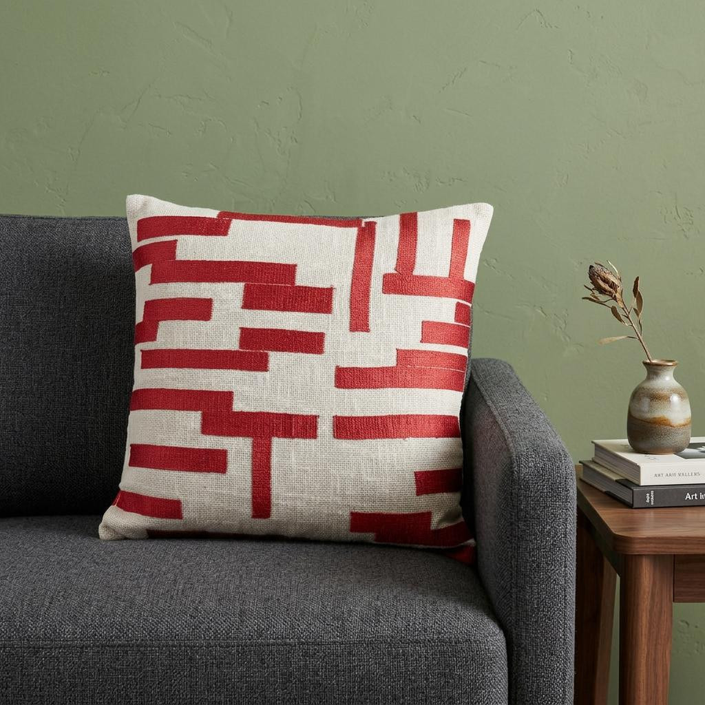 Bring a bit of fashion and zip to your space with this eye-catching and comfy 20-inch red geometric cotton blend throw pillow with embroidery. This red colored decorative pillow is made from high grade cotton blend that is durable and long lasting. This soft polyfill filled pillow not only is decorative but made to be comfy and cozy all day long. For anyone that loves to decorate or accent their space with color and texture. Decorative pillows are a great way to change up the look and feel of your space easily and quickly. 20-inch H x 20-inch W x 8-inch D