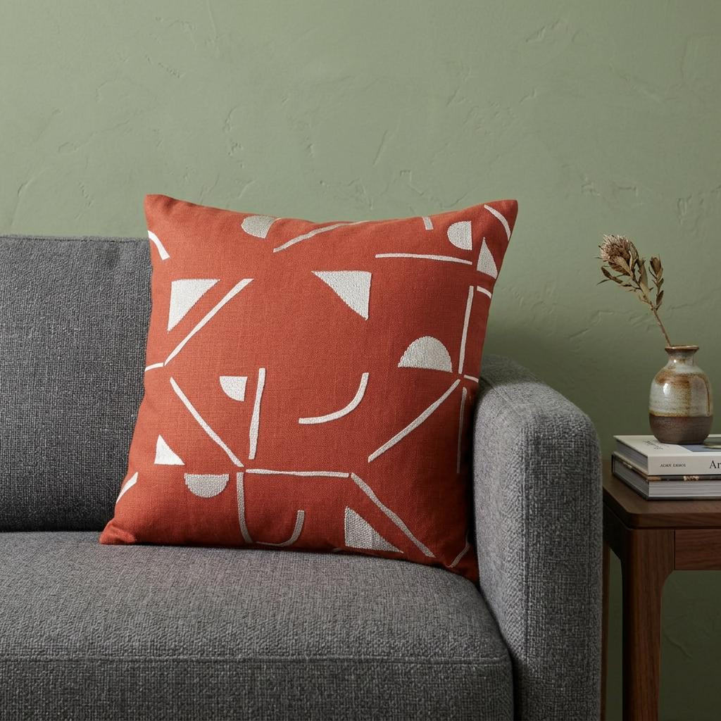 Add an air of fashion to your room and rejuvenate the space with this cute and fashionable 24-inch orange geometric cotton blend throw pillow with embroidery. Durable orange cotton blend has been used to give this pillow a beautiful look that will stand the test of time. This soft polyfill filled pillow not only is decorative but made to be comfy and cozy all day long. For anyone that loves to decorate or accent their space with color and texture. Decorative pillows are a great way to change up the look and feel of your space easily and quickly. 24-inch H x 24-inch W x 9-inch D