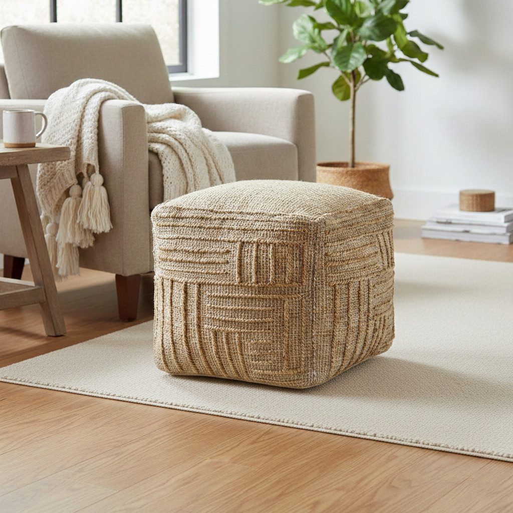 blend cube striped pouf ottoman, cube striped pouf ottoman, striped pouf ottoman, jute blend cube striped pouf, 18" natural jute blend cube |