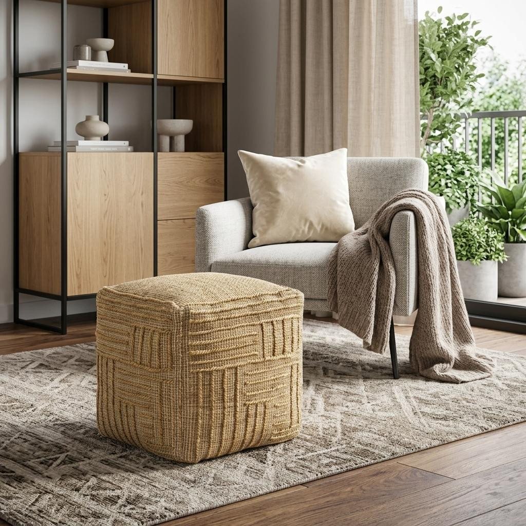 Get ready to relax with this 18-inch natural jute blend cube striped pouf ottoman. Add chic style to your space with this fun pouf that not only looks cool but can be a great foot rest or extra seat when needed. Handmade from jute this textural artisanal geo stripe pouf has an earthy bohemian flair. Expertly upholstered with padding and soft jute blend in a striped pattern, this ottoman is as comfortable as it is good looking. Easy to blend into most any room, a ottoman is a way to add a good looking accent to your space that can also be practical and useful. 18-inch h x 18-inch w x 18-inch d.