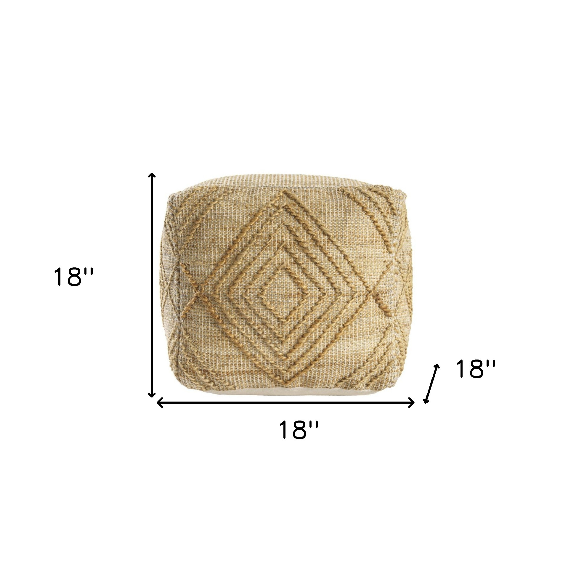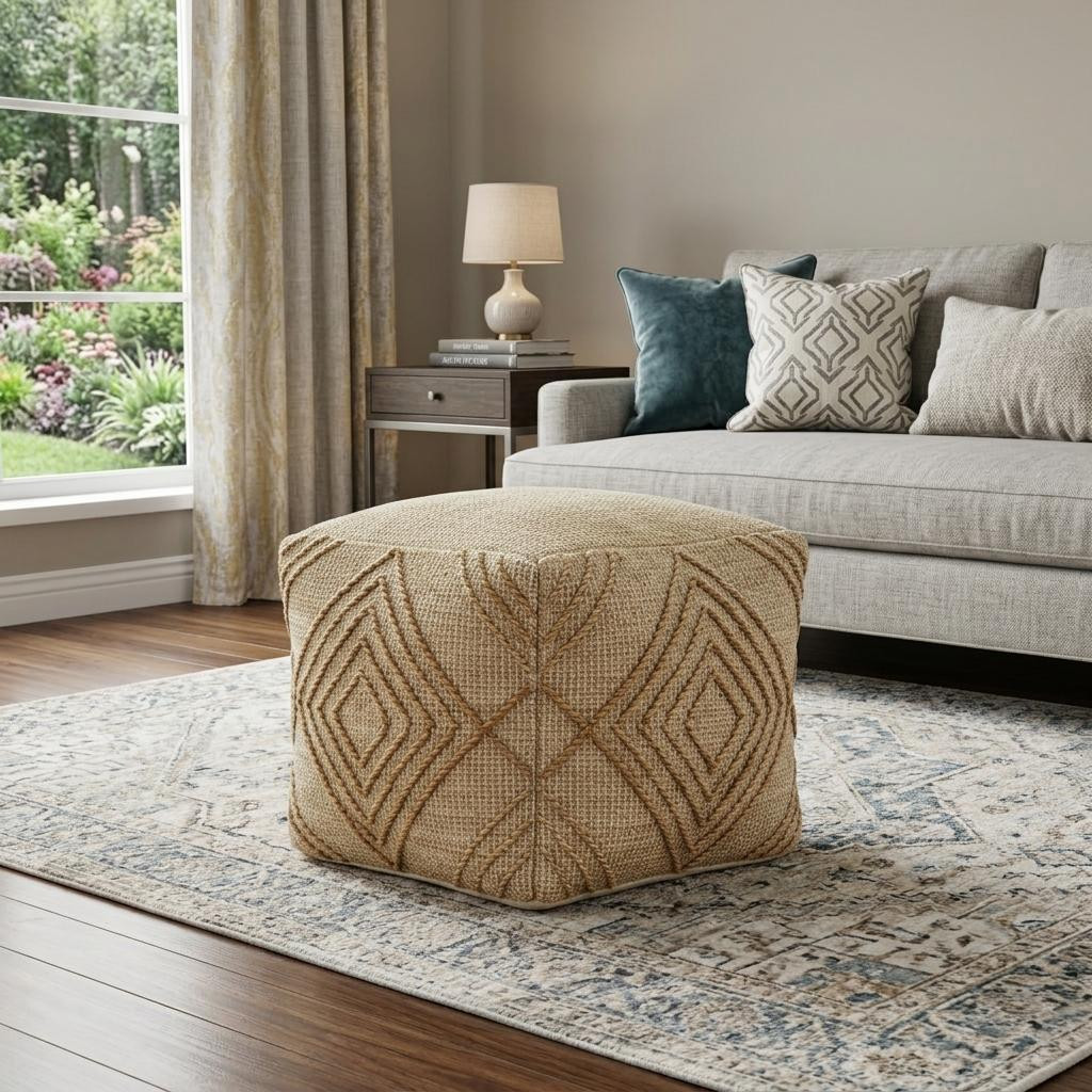 Add a good looking decorative accent to your space that is also practical for seating. Add chic style to your space with this fun pouf that not only looks cool but can be a great foot rest or extra seat when needed. Handmade from jute this textural artisanal pouf has an earthy bohemian flair. Expertly upholstered with padding and soft jute blend in a geometric diamonds pattern, this ottoman is as comfortable as it is good looking. Ottomans are multi-functional additions to your space that add fashion and practical value. 18-inch h x 18-inch w x 18-inch d.