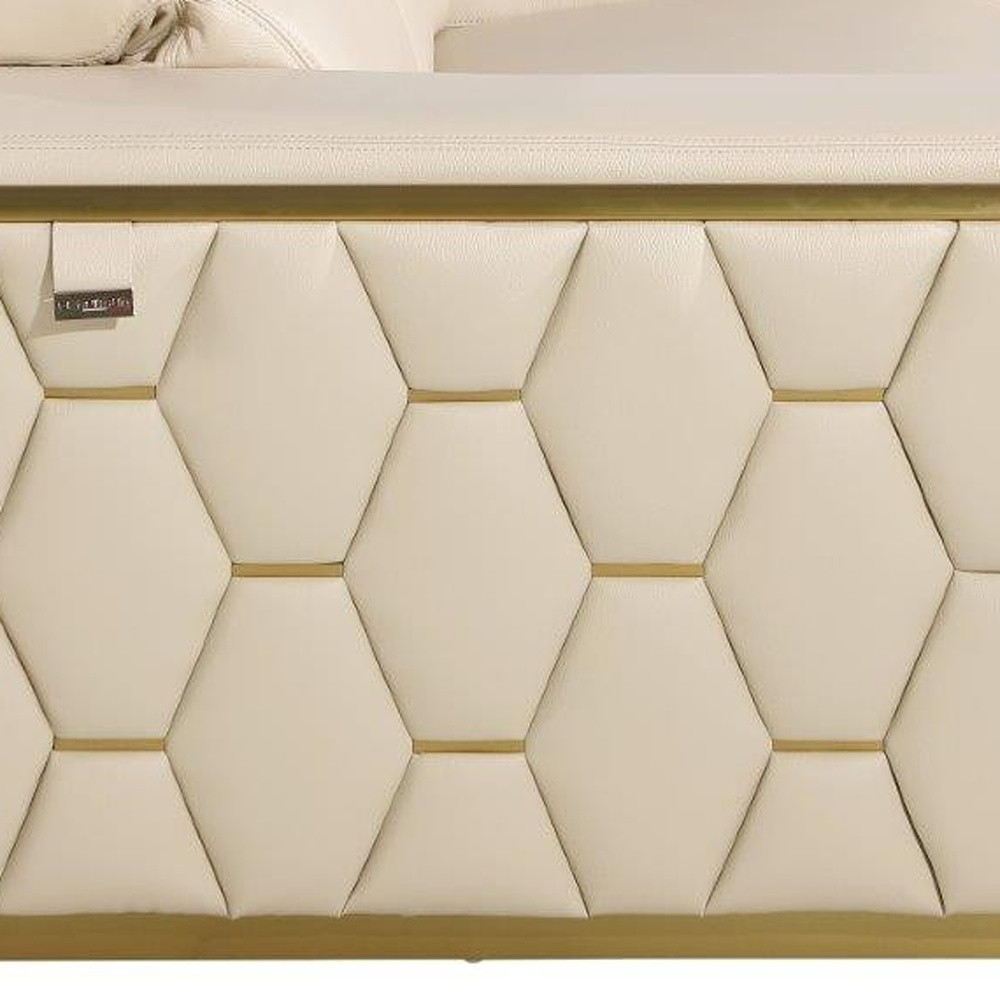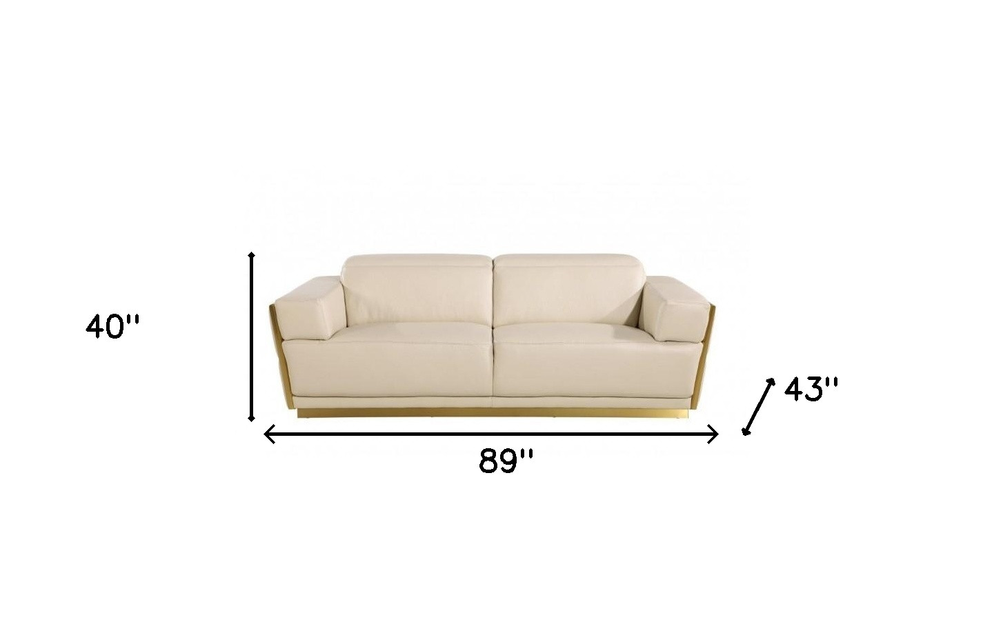 Superior construction from fabulously soft and high grade Italian leather gives this 89-inch beige and gold leather sofa a leg up on the competition. The premium leather makes your lounging luxuriously comfortable and adds an elegant appeal to your space. The wide arms offer a comfy place to rest, while the tufted stitching on the sides brings in a hint of art deco design sense. Finished off with gold trim that creates a contemporary chic color combination. A great showpiece for your room, this sofa is a must have. 40-inch H x 89-inch W x 43-inch D