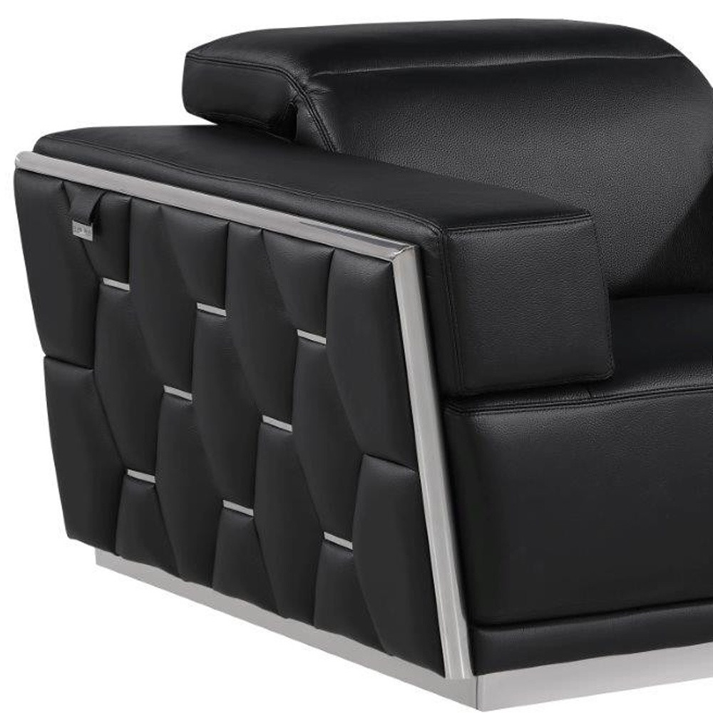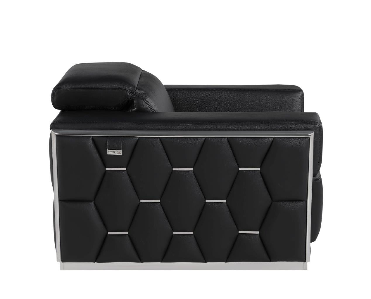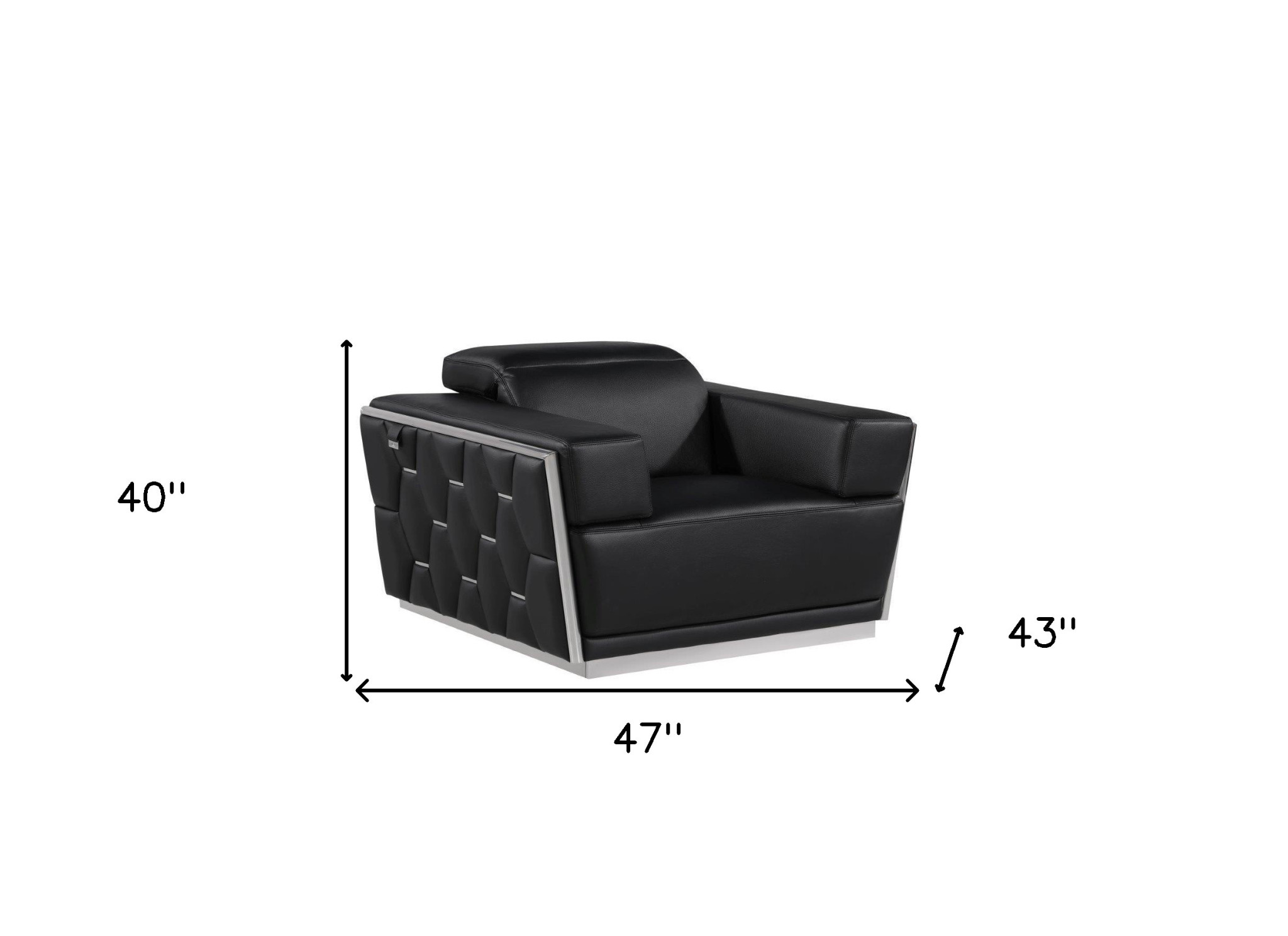 A mix of form and function, this 47-inch black and silver Italian leather club chair will bring a good looking and usable accent to your space. This sturdy Italian leather upholstered club chair comes in a chic black color with chrome silver accents to give your space a modern look. Giving the chair stability and structure, the inner frame is constructed with high quality solid wood, includes comfy armrests, and features a tight back that comes complete with soft and comfortable cushioning. A unique flared square shape and tufted stitching detailing on the outside makes this chair unique and stylish. 40-inch h x 47-inch w x 43-inch d.