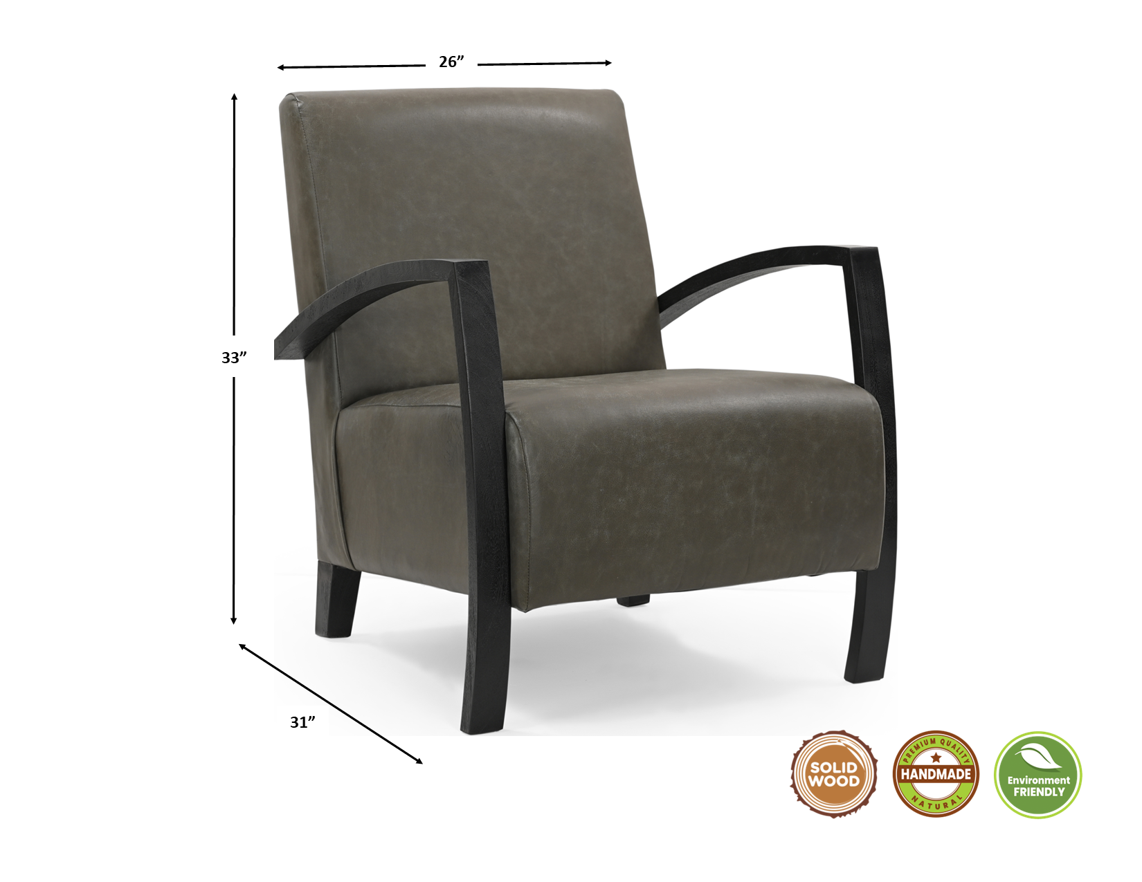 Fill your living room, bedroom, or office with fashionable seating options with this 26-inch green and black top grain leather arm chair. This sturdy top grain leather upholstered arm chair comes in a chic solid green color to give your space just the right look. Giving the chair stability and structure, the inner frame is constructed with high quality solid wood, includes comfy armrests, and features a fixed back that comes complete with soft and comfortable cushioning. 33-inch h x 26-inch w x 31-inch d.
