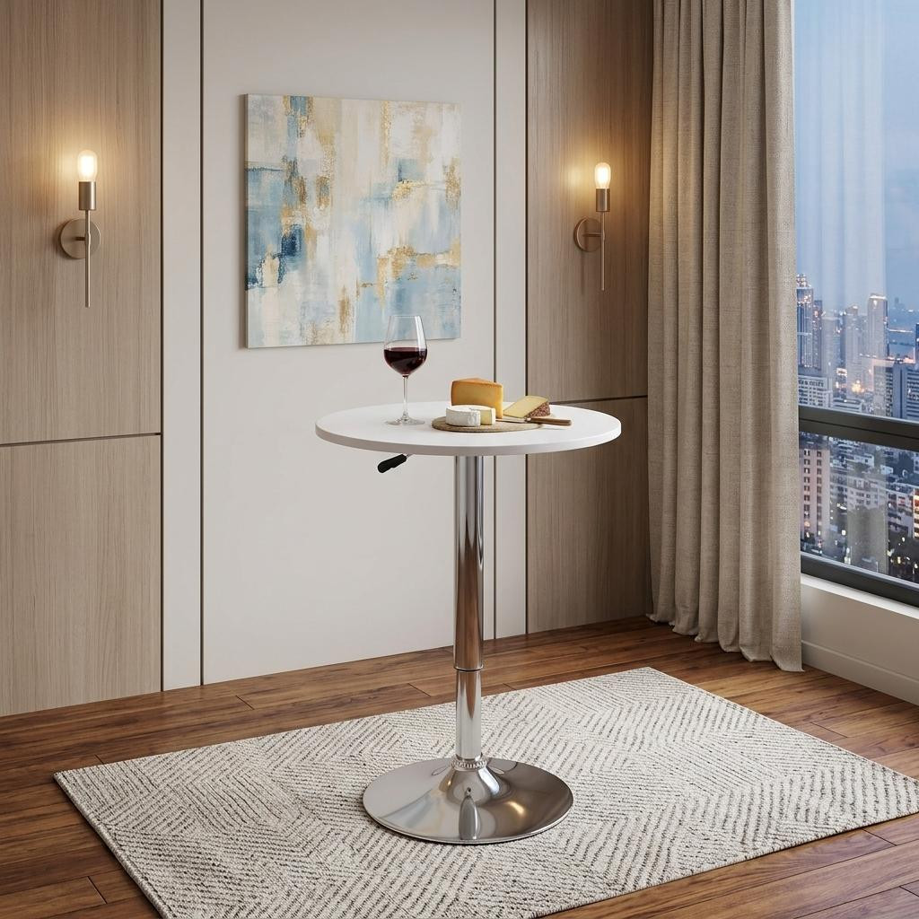 Elevate your bar and restaurant space with this sophisticated 24-inch white and silver rounded bar table. Crafted from high-quality manufactured wood and iron, this table features a glossy white top and a sleek silver base. The fixed table mechanism and pedestal base ensure stability and durability, making it perfect for busy commercial settings. The round shape offers a modern touch, creating a welcoming atmosphere for your guests to enjoy drinks and meals. Add a touch of elegance and style to your establishment with this chic and functional bar table that effortlessly blends a clean white finish with striking silver accents. 34-inch H x 24-inch W x 24-inch D