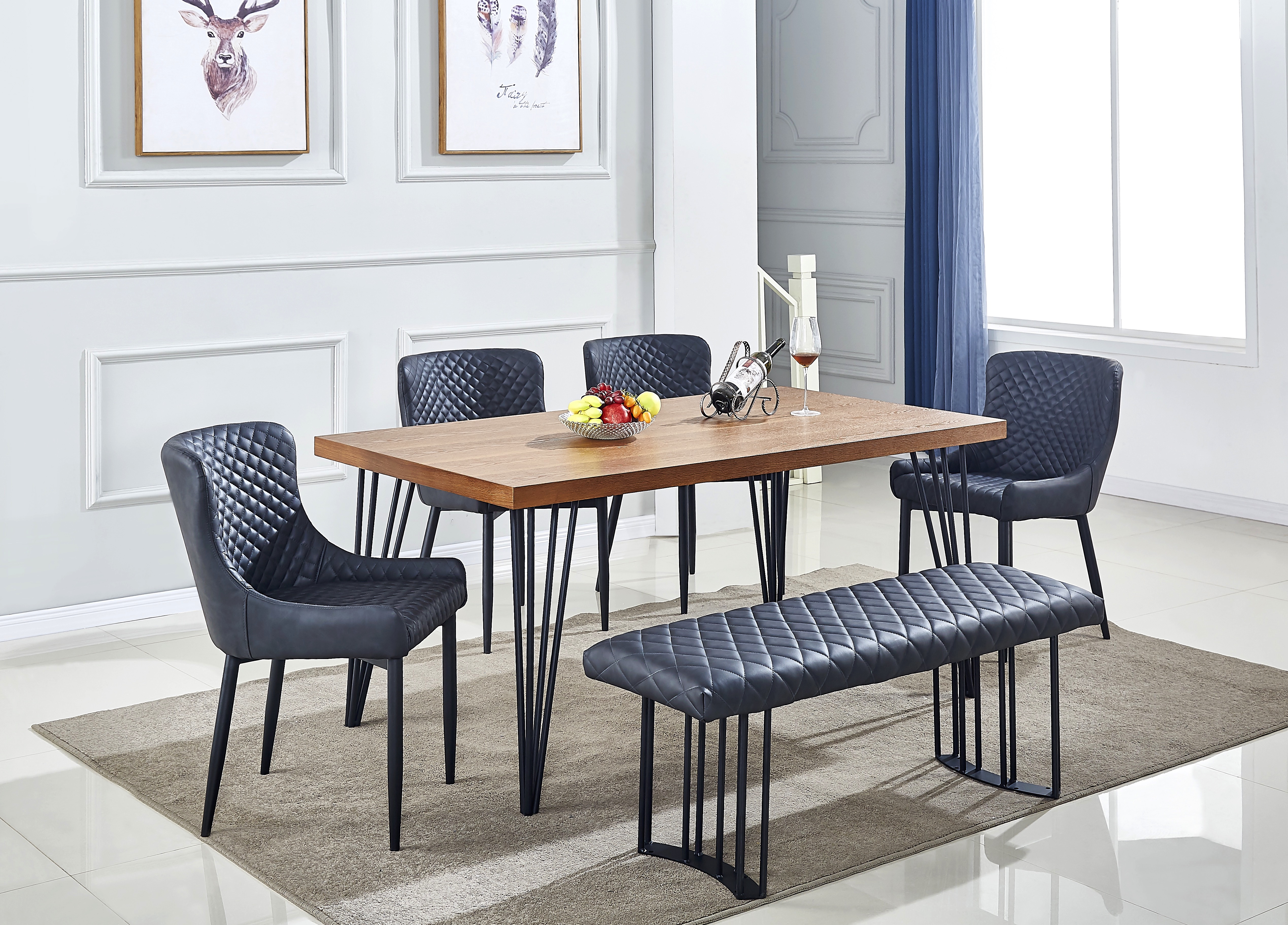 Distinctive in style the 47-inch dark gray and black faux leather upholstered dining bench radiates a versatile charm. The dark gray tufted faux leather upholstery top of this bench is a nice contrast to the high quality, black metal of the base. Add this bench to your kitchen or dining room for convenient seating at the table. Benches don't have to be unsightly. Increase your seating and the fashion quotient of your room all at the same time with this hard wearing, versatile, and good looking bench. 18-inch h x 47-inch w x 16-inch d.