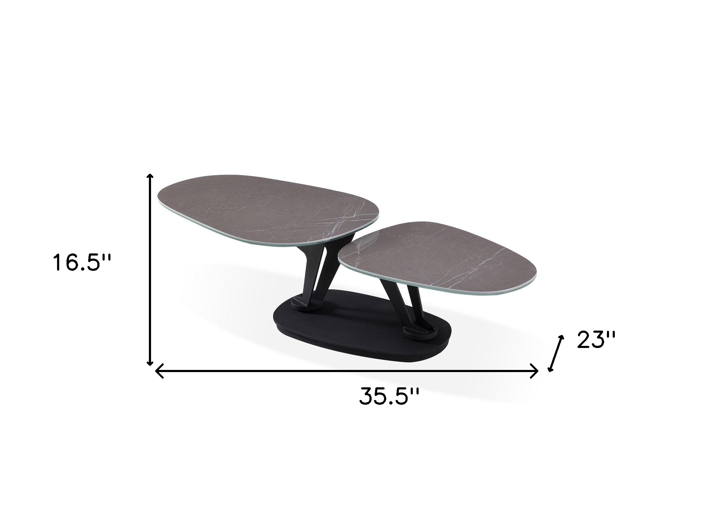Make your living room or family room really stand out with this contemporary 36-inch gray and black faux marble and metal oval coffee table. The gray ceramic faux marble double top surface of this table is a nice visual contrast to the high quality, black angled geometric metal of the base. This oval table is a way to add some striking and interesting dimension to your space. If you're looking for something that can fit into a living area, bedroom, or office, this coffee table is for you. 16.5-inch h x 35.5-inch w x 23-inch d.