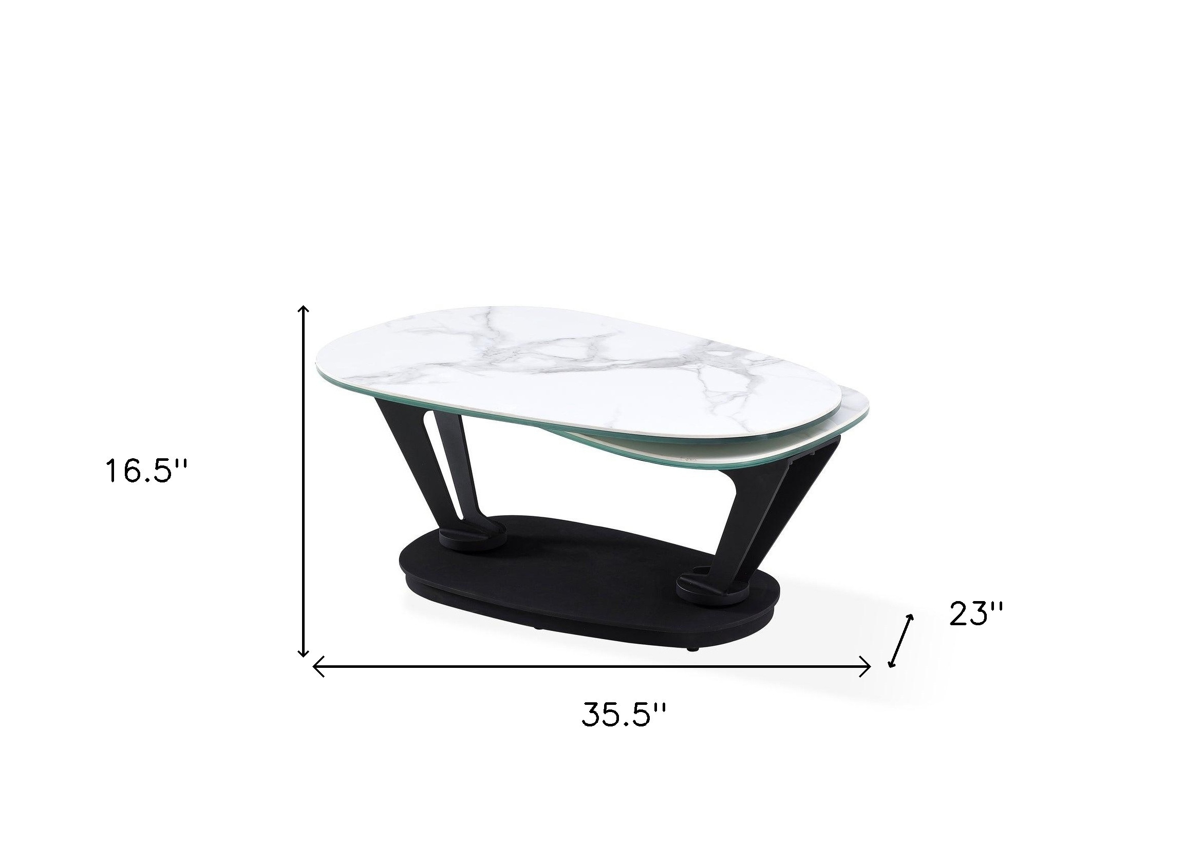 Make a statement with the 36-inch white and black ceramic tile and metal oval floor shelf coffee table and infuse a dash of character and personality into your space. The white ceramic faux marble double top surface of this table is a nice visual contrast to the high quality, black angled geometric metal of the base. This oval table is a way to add some striking and interesting dimension to your space. If you're looking for something that can fit into a living area, bedroom, or office, this coffee table is for you. 16.5-inch h x 35.5-inch w x 23-inch d.