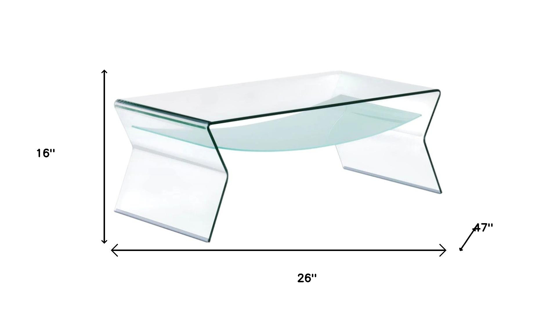 This stylish 26-inch clear glass coffee table is not only practical, but good looking and built to last. This table is made from glass in a clear color throughout the base and top. This rectangular table is an classic yet updated way to accent your room. It has an attractive design that will definitely breathe some fresh air into your interior. 16-inch h x 26-inch w x 47-inch d.