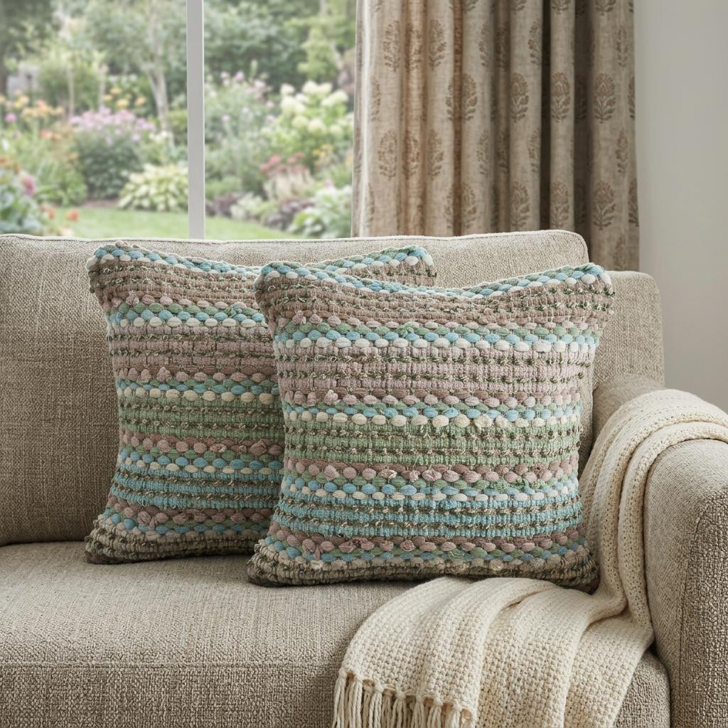 Unique and decorative, this comfortable set of two 18-inch beige blue and green striped cotton blend throw pillows will leave a lasting impression. These great looking soft decorative pillows are expertly made of a blend of durable and long lasting cotton and polyester in a calming muted color combination. This soft polyester filled pillow not only is decorative but made to be comfy and cozy all day long. ideal for anyone that loves to decorate or accent their space with color and texture. 18-inch h x 18-inch w x 4-inch d