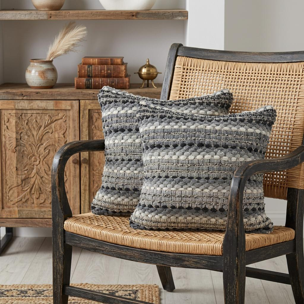 The set of two 18-inch black gray and ivory striped cotton blend throw pillows with texture is the perfect decorative accessory for your home. An ultra durable chindi rag woven cotton blend has been used to make this decorative pillow set a beautiful look that will stand the test of time. Decorative pillows are a great way to change up the look and feel of your space easily and quickly. A great decorative accessory to add color and dimension to your favorite chair, accent your sofa, or to use as part of your bed ensemble. 18-inch h x 18-inch w x 4-inch d.
