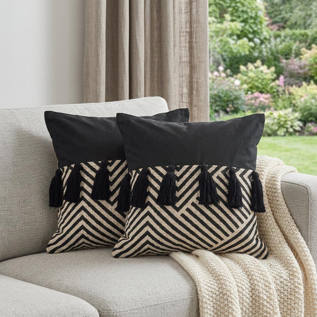 Unique and decorative, this comfortable set of two black chevron cotton throw pillow with tassels will leave a lasting impression. This black colored decorative pillow set is made from high grade cotton that is durable and soft to the touch. Charming decorative tassels give this design texture along with a hand-crafted look and feel. For anyone that loves to decorate or accent their space with color and texture. A great decorative accessory for your favorite chair, to accent your sofa, or to use as part of your bed ensemble. 20-inch H x 20-inch W x 4-inch D