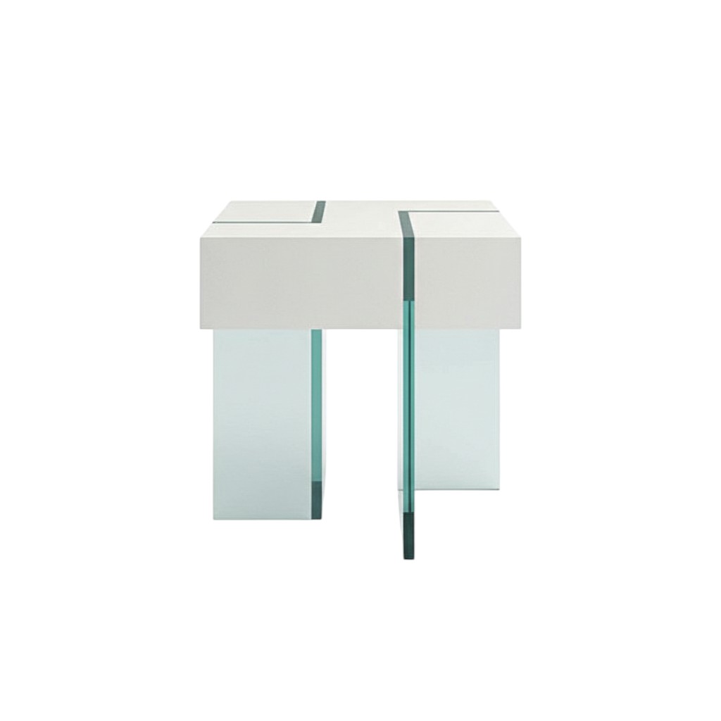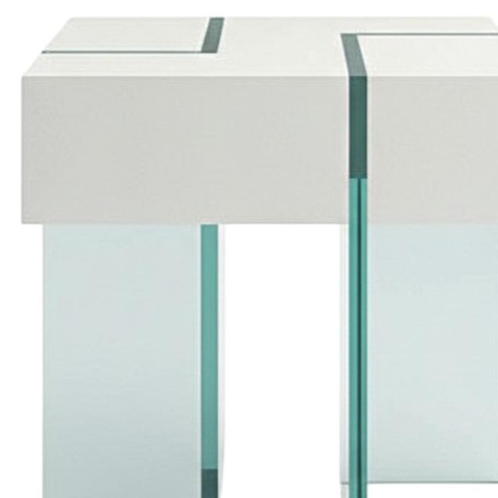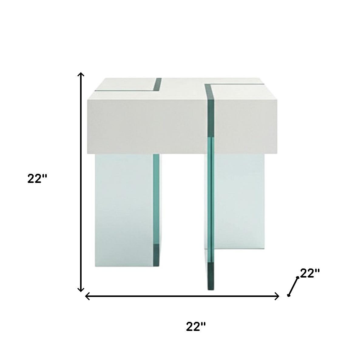 Distinctive in style the 22-inch white wood and glass square sled end table radiates a versatile charm. A sleek white lacquered top surface pairs with clear glass legs in a geometric design to give this unique table a fresh and updated contemporary look. An ideal location for placing your snacks and drinks, and a place to keep your lamp, frames, or other accessories. You can also use it as an entryway table to hold your keys. 22.00-inch h x 22.00-inch w x 22.00-inch d.