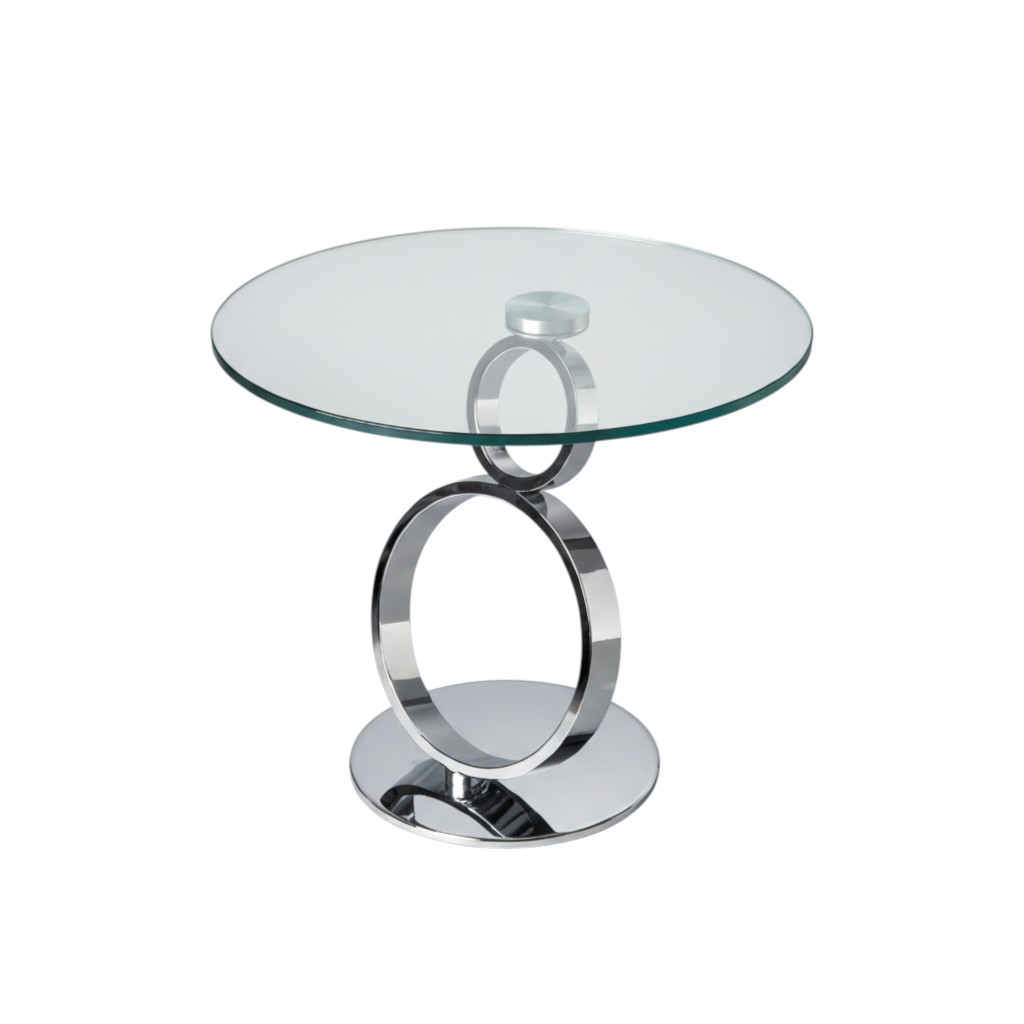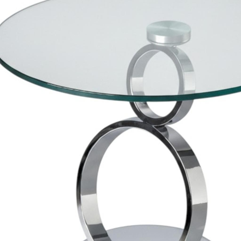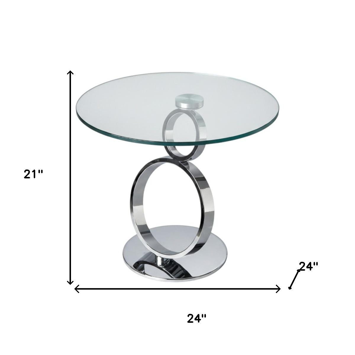 Show off your exquisite taste with this 21-inch clear and silver glass and metal round pedestal end table. The silver coloration of the high quality geometric rings metal pedestal base marries nicely with the clear round glass top surface. Side tables are a great way to flank your sofa, use as an accent next to your favorite chair, or can even be used bedside. This versatile table is a great accent for most any room. 21.00-inch h x 24.00-inch w x 24.00-inch d.