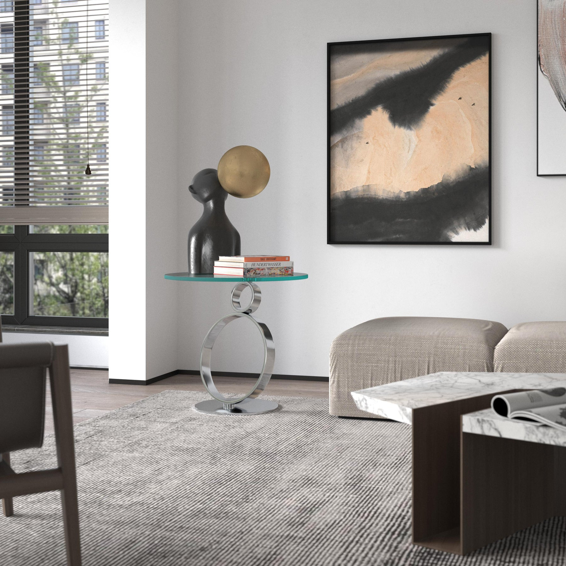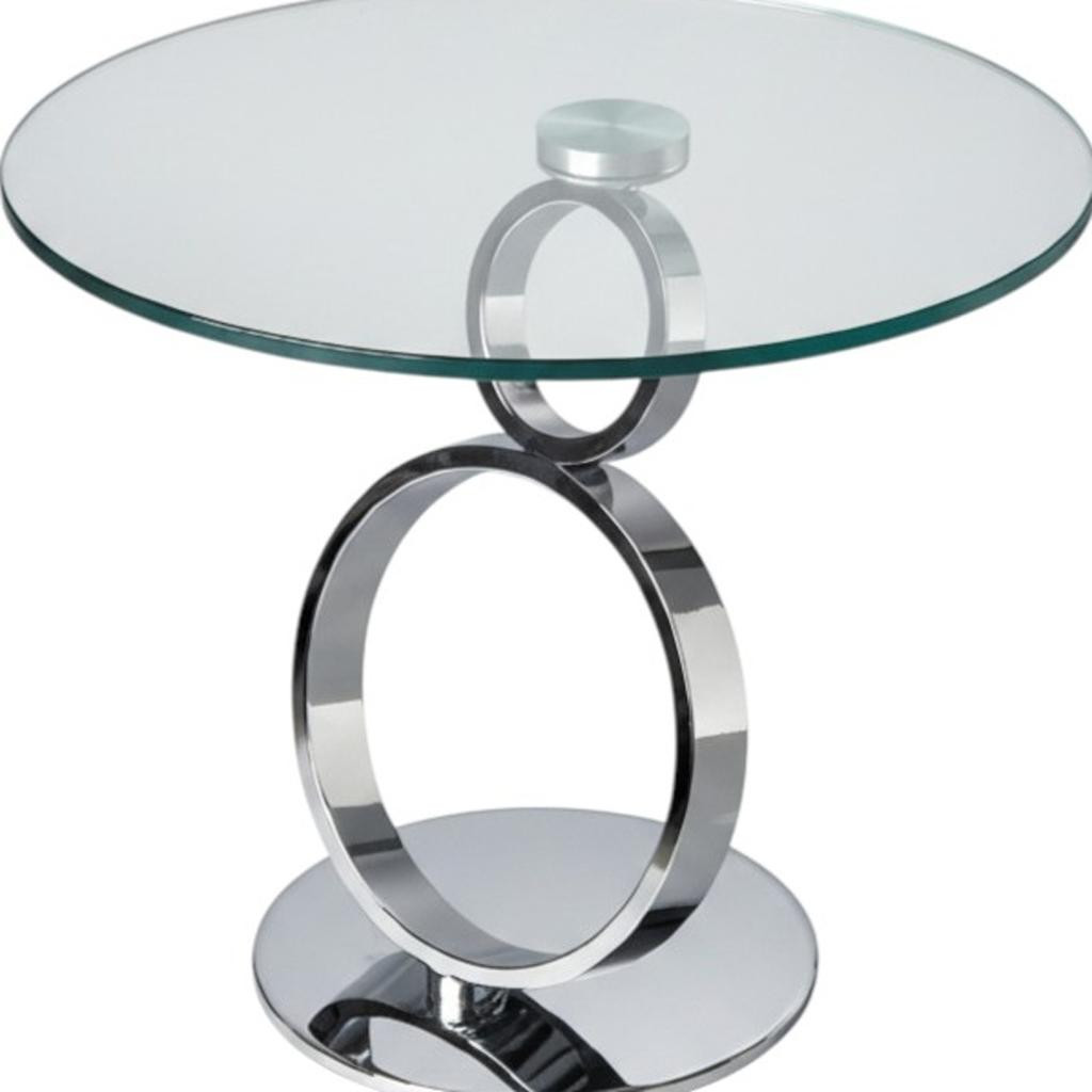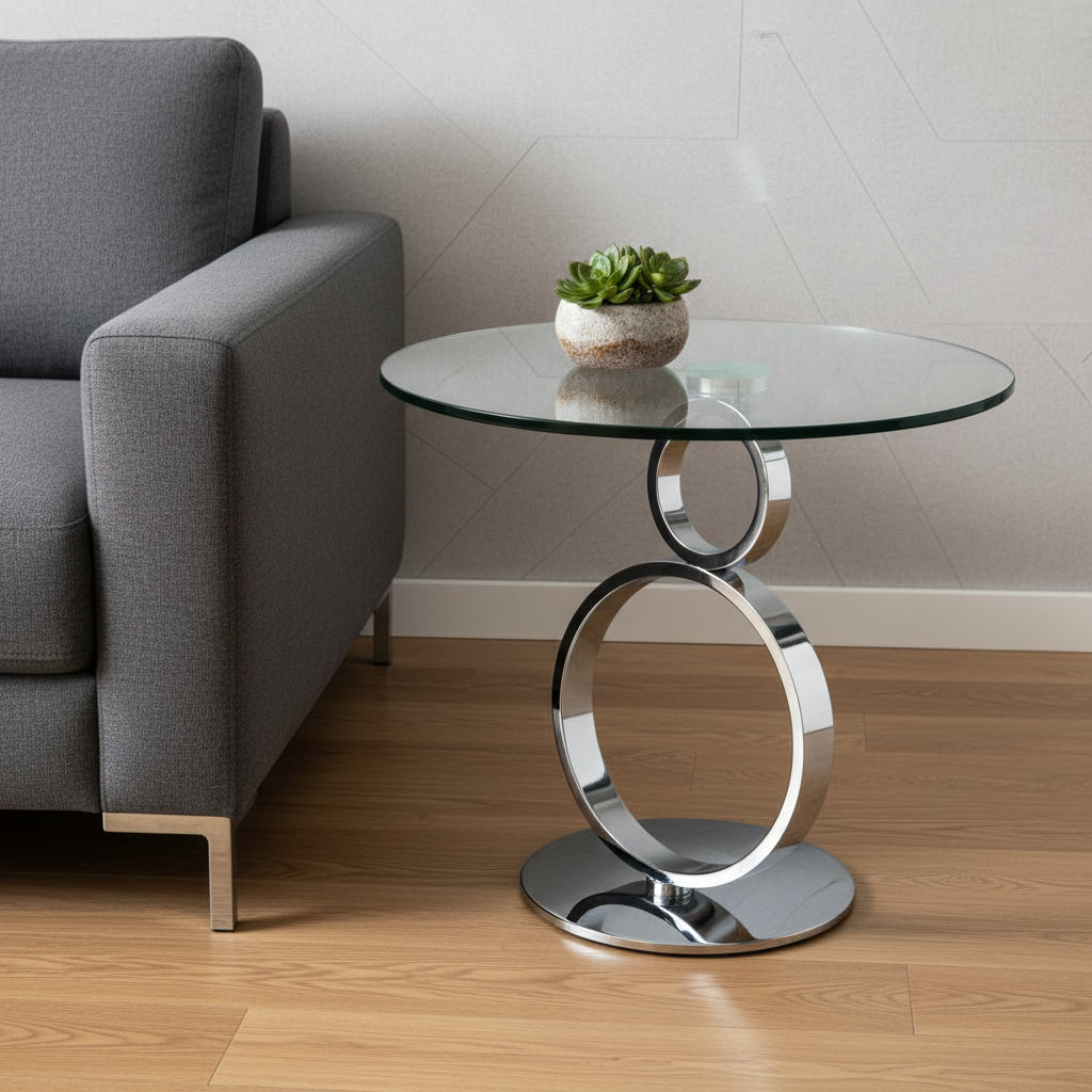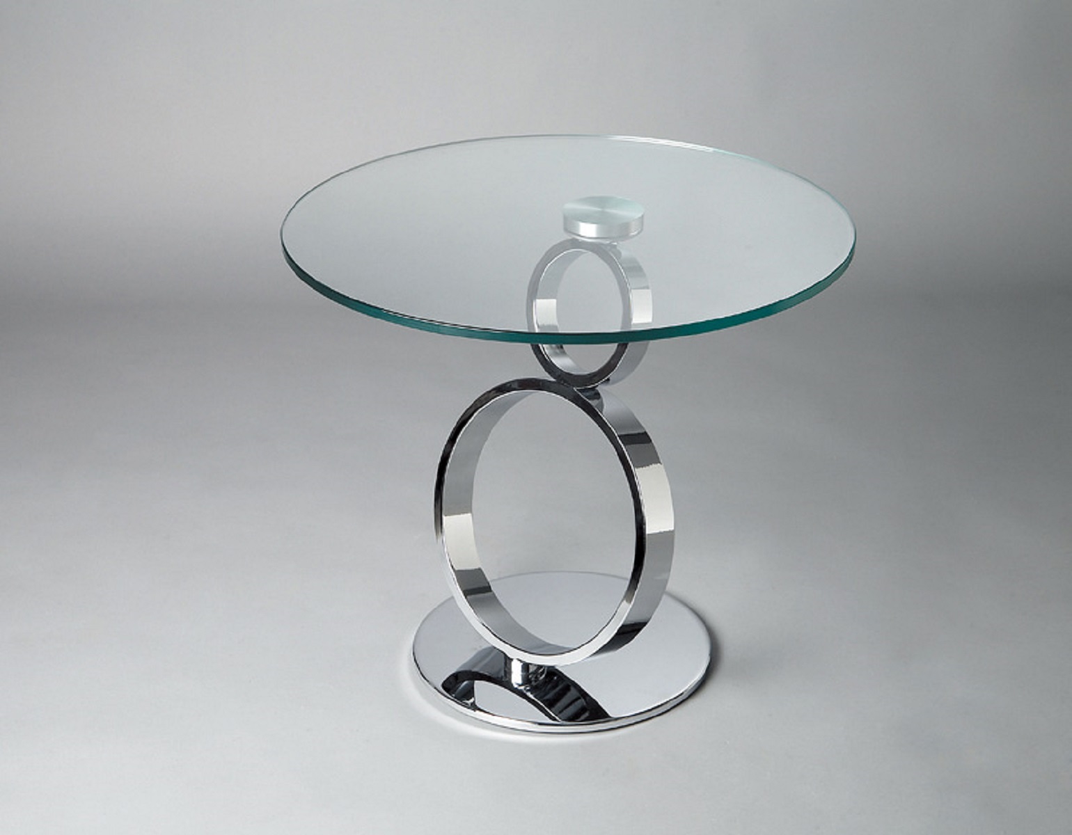 Show off your exquisite taste with this 21-inch clear and silver glass and metal round pedestal end table. The silver coloration of the high quality geometric rings metal pedestal base marries nicely with the clear round glass top surface. Side tables are a great way to flank your sofa, use as an accent next to your favorite chair, or can even be used bedside. This versatile table is a great accent for most any room. 21.00-inch h x 24.00-inch w x 24.00-inch d.