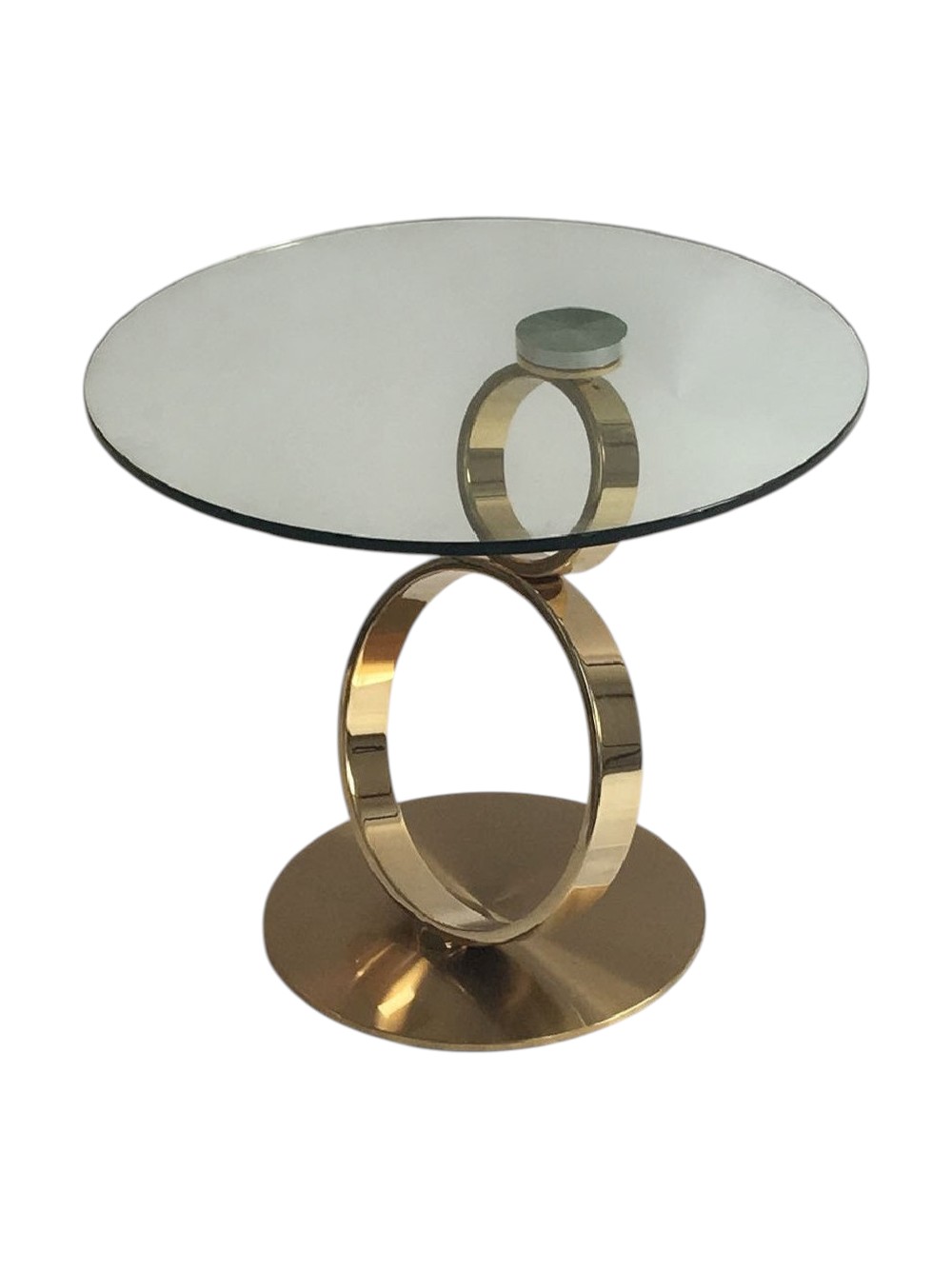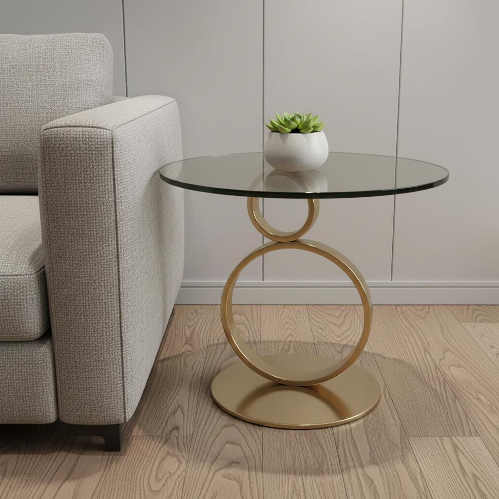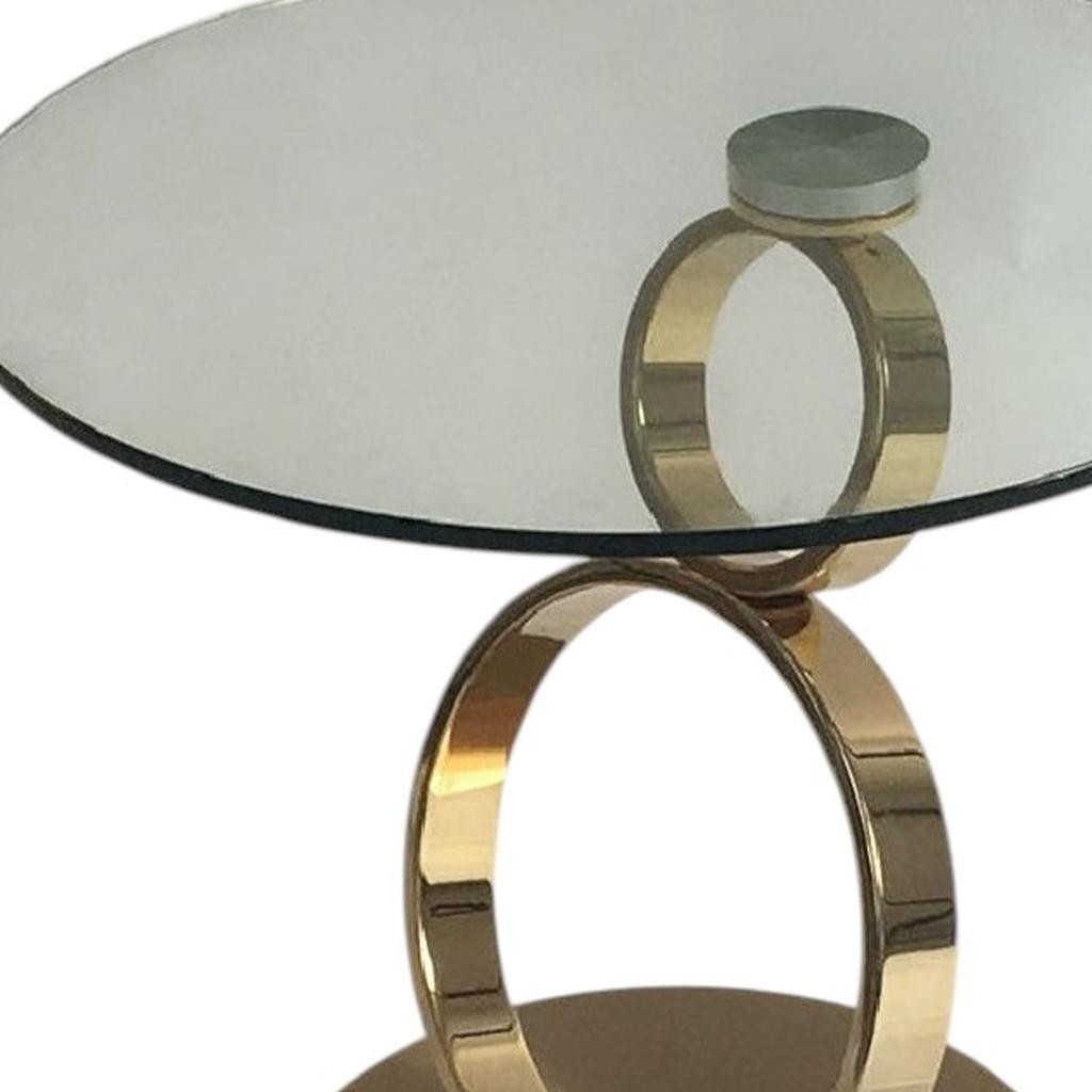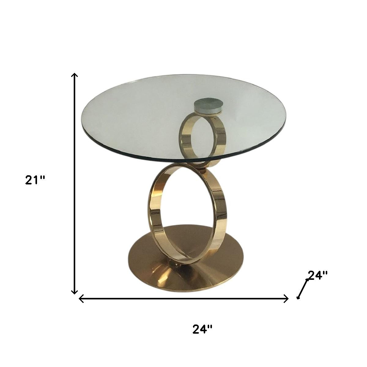 Show off your exquisite taste with this 21-inch clear and gold glass and metal round pedestal end table. The gold coloration of the high quality geometric rings metal pedestal base marries nicely with the clear round glass top surface. Side tables are a great way to flank your sofa, use as an accent next to your favorite chair, or can even be used bedside. This versatile table is a great accent for most any room. 21.00-inch h x 24.00-inch w x 24.00-inch d.