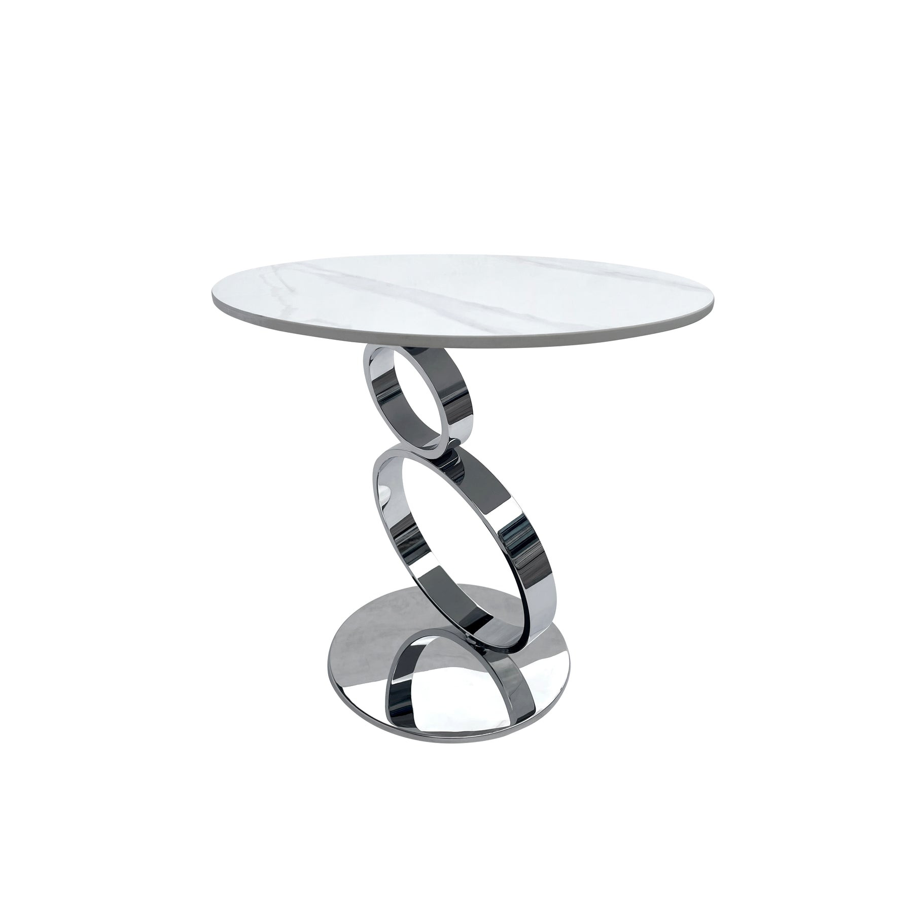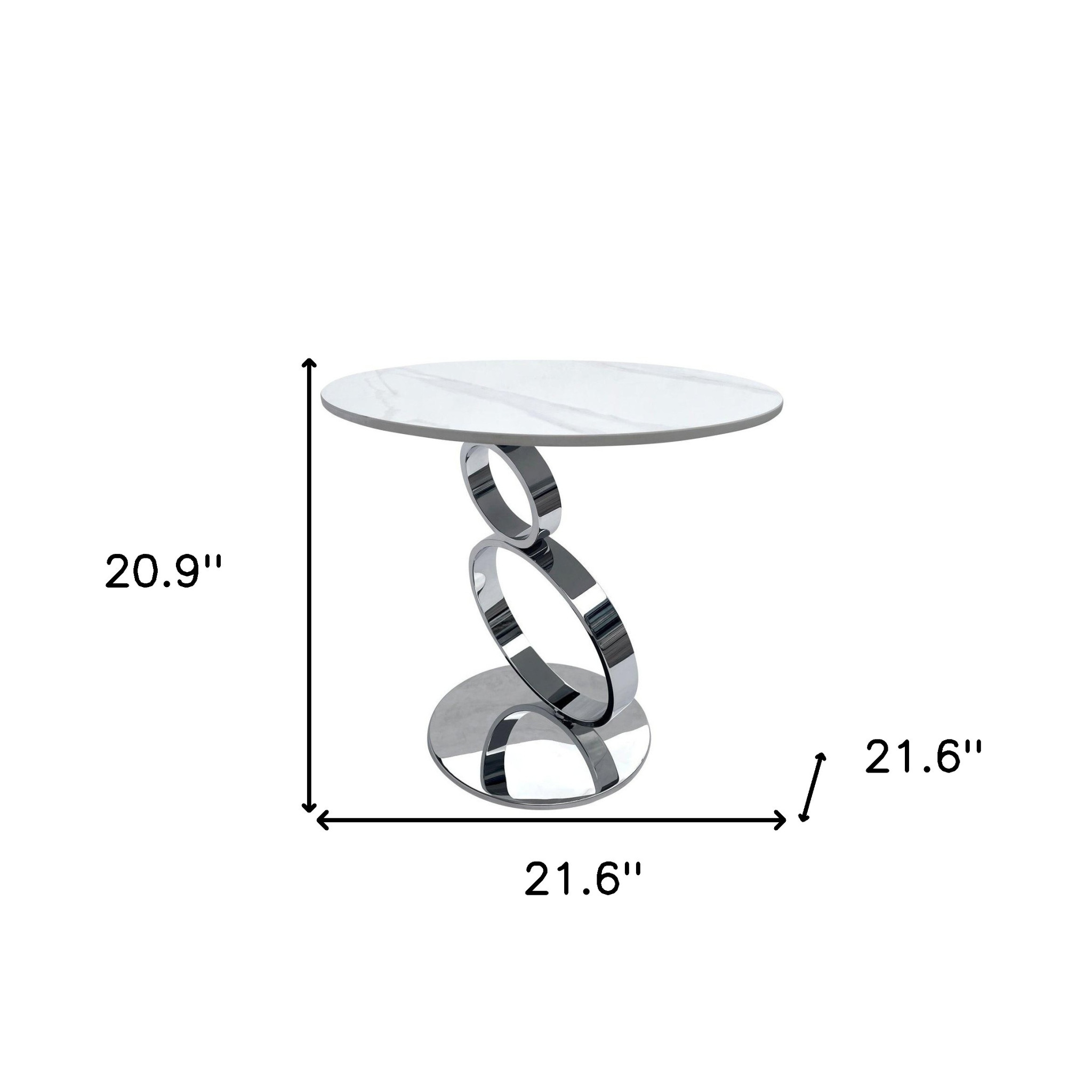 Distinctive in style the 21-inch white and silver stone and stainless steel round pedestal end table radiates a contemporary charm. The silver coloration of the high quality, unique geometric circles stainless steel base marries nicely with the white faux marble stone top. A great accent on either side of the sofa or bed, this adorable end or side table is just what you need. This versatile table is a great accent for most any room. 20.9-inch h x 21.6-inch w x 21.6-inch d.