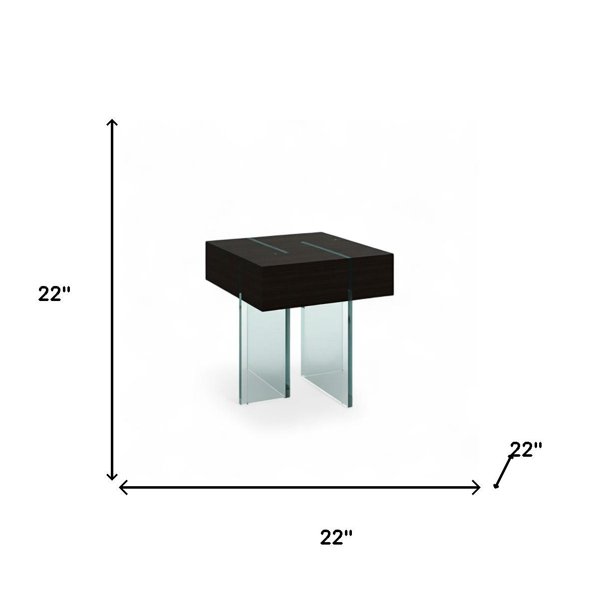 Optimize your space and add some charm to your room with the 22-inch espresso and clear wood and glass square sled end table. A sleek black lacquered top surface pairs with clear glass legs in a geometric design to give this unique table a fresh and updated contemporary look. An ideal location for placing your snacks and drinks, and a place to keep your lamp, frames, or other accessories. You can also use it as an entryway table to hold your keys. 22.00-inch h x 22.00-inch w x 22.00-inch d.