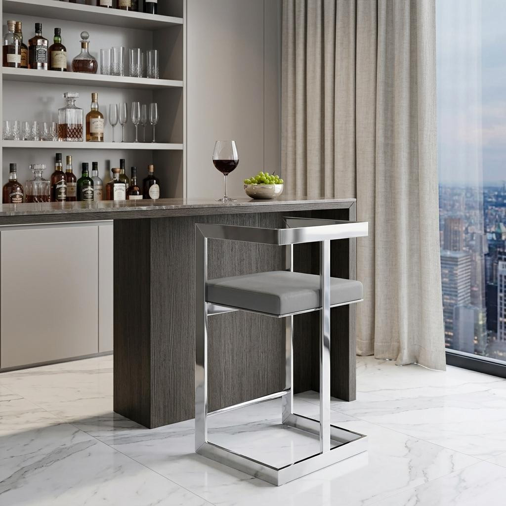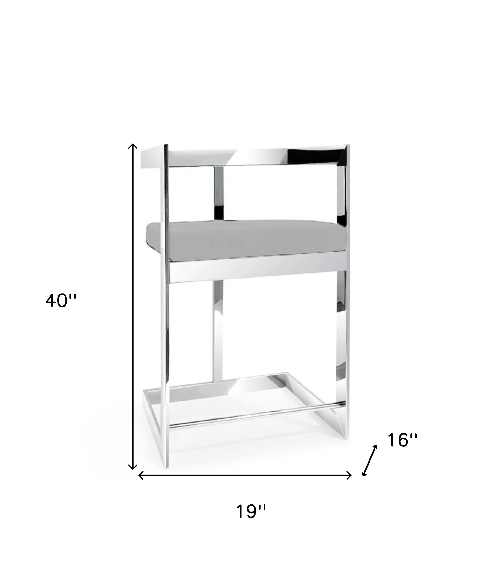 Bring a trendy bar vibe to your space, with this 30-inch gray and silver velvet and metal low back bar height bar chair. A silver metal frame is finished off with a gray velvet seat that is the epitome of quality construction and design. Designed with a footrest for comfort and convenience. A low back mixed with a rectangle shaped seat design makes this chair both comfortable and fashionable. 40.00-inch h x 19.00-inch w x 16.00-inch d.