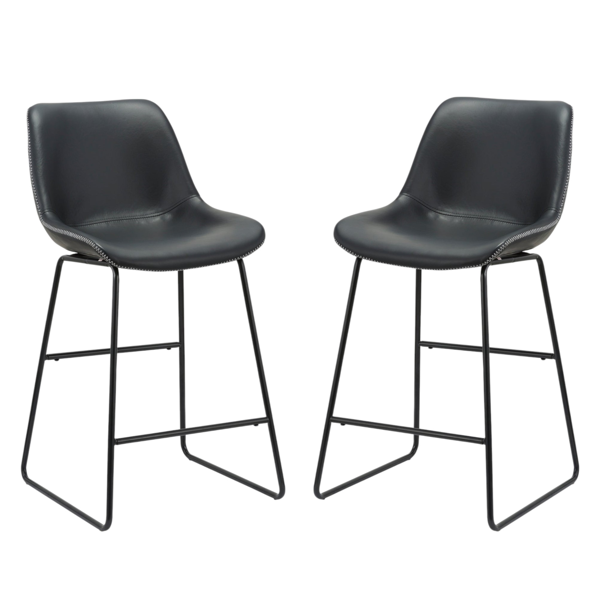 Bring a trendy bar vibe to your space, with this set of two black faux leather and metal low back counter height bar chairs. A sleek black monotone color gives this metal and faux leather stool a fresh and updated look. The bucket shape of the seat combines with a low_back to give this chair a comfortable and fashionable look. Designed with a footrest for comfort and convenience. 38-inch h x 21-inch w x 20-inch d.