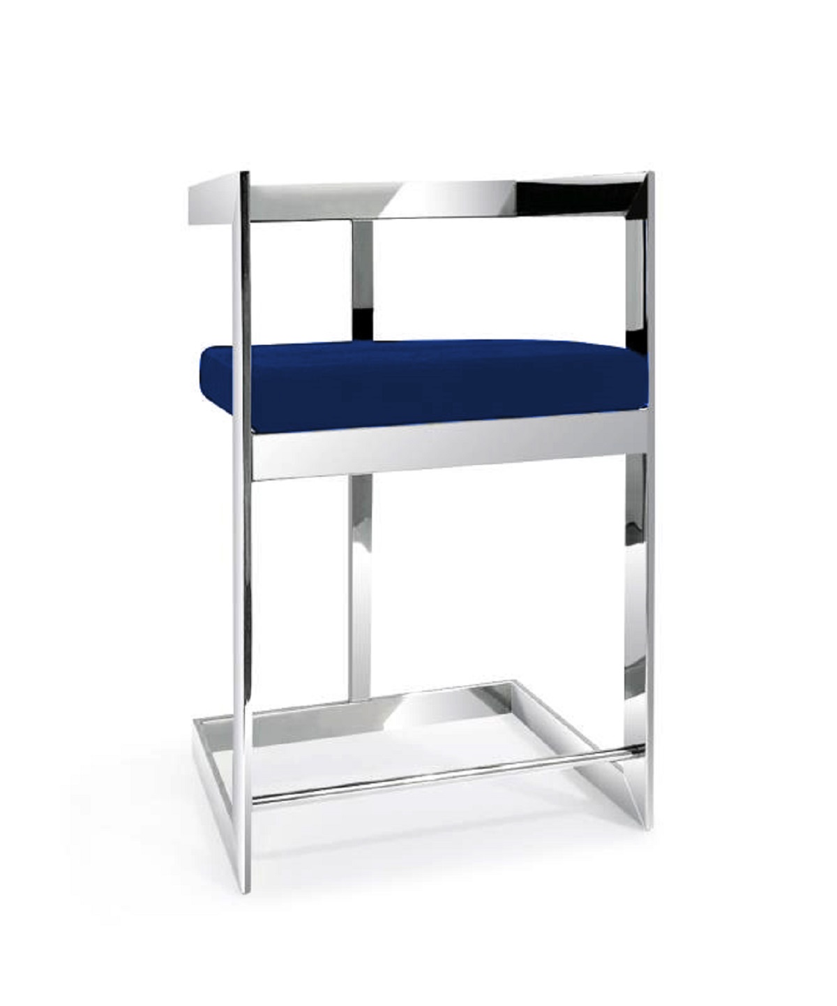 Bring a trendy bar vibe to your space, with this 26-inch blue and silver metal and velvet low back counter height bar chair. The silver coloration runs throughout this good looking metal and velvet stool. The blue and silver velvet seat of this stool is a nice contrast to the high quality, silver metal of the base. Designed with a footrest for comfort and convenience. The rectangle shape of the seat combines with a low back to give this chair a comfortable and fashionable look. 40-inch h x 19-inch w x 16-inch d.