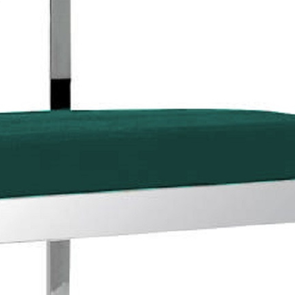 Bring a trendy bar vibe to your space, with this 26-inch green and silver velvet and stainless steel low back counter height bar chair. The base of this stool is made from stainless steel in a silver color that is a nice contrast to the green velvet seat. A low_back mixed with a rectangle shaped seat design makes this chair both comfortable and fashionable. Designed with armrests for your comfort, this chair also features a footrest for comfort and convenience. 36-inch h x 19-inch w x 16-inch d.