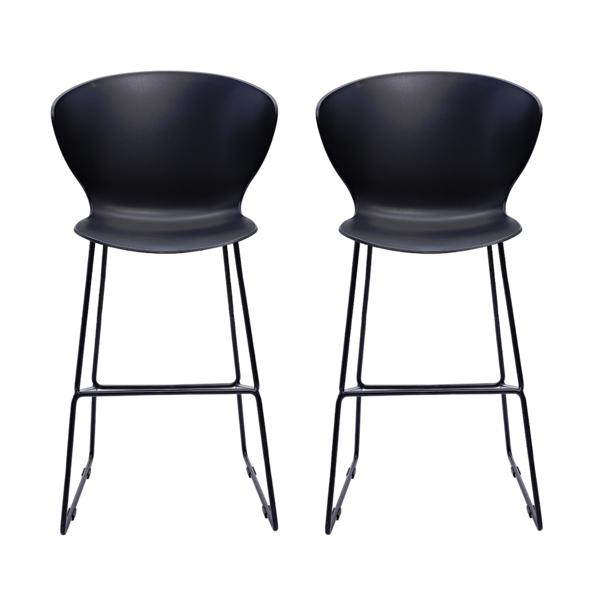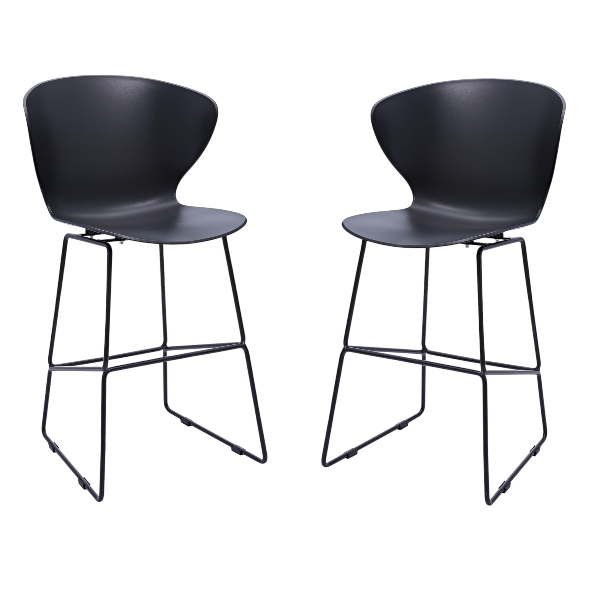 Bring a trendy bar vibe to your space, with this set of two 26-inch black heavy duty plastic and metal low back counter height bar chairs. A sleek black monotone color gives this metal and plastic stool a fresh and updated look. Not only good looking and stylish, this chair features a rectangle shaped seat and a low_back for the ultimate in comfort and enjoyment. Designed with a footrest for comfort and convenience. 40-inch h x 21-inch w x 19-inch d.