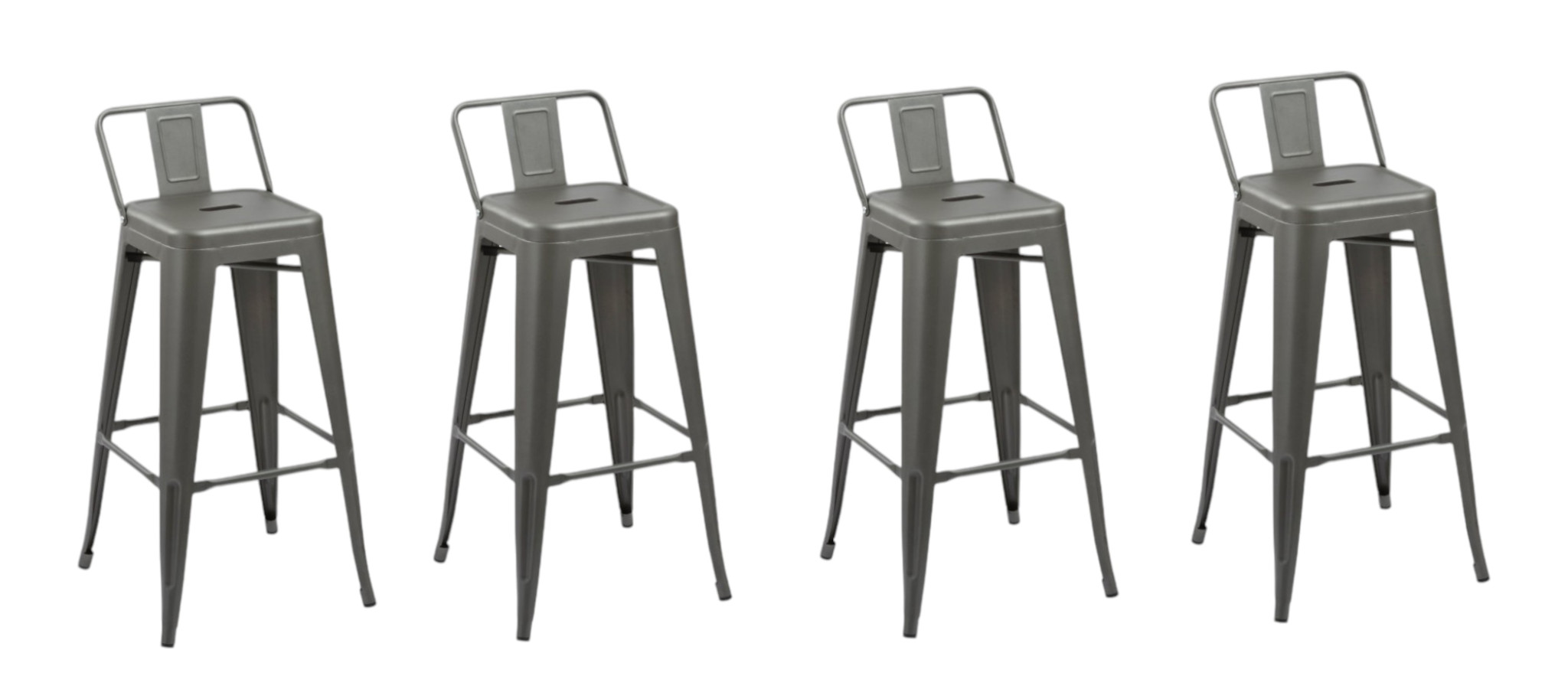 With this set of four 26-inch dark gray steel and metal low back counter height bar chairs you can add design and extra seating to your space. A solid dark gray metal frame is finished off with a matching dark gray steel seat, giving this chair a chic monotone look. The square shape of the seat combines with a low_back to give this chair a comfortable and fashionable look. Designed with a footrest for comfort and convenience. 32-inch h x 18-inch w x 18-inch d.