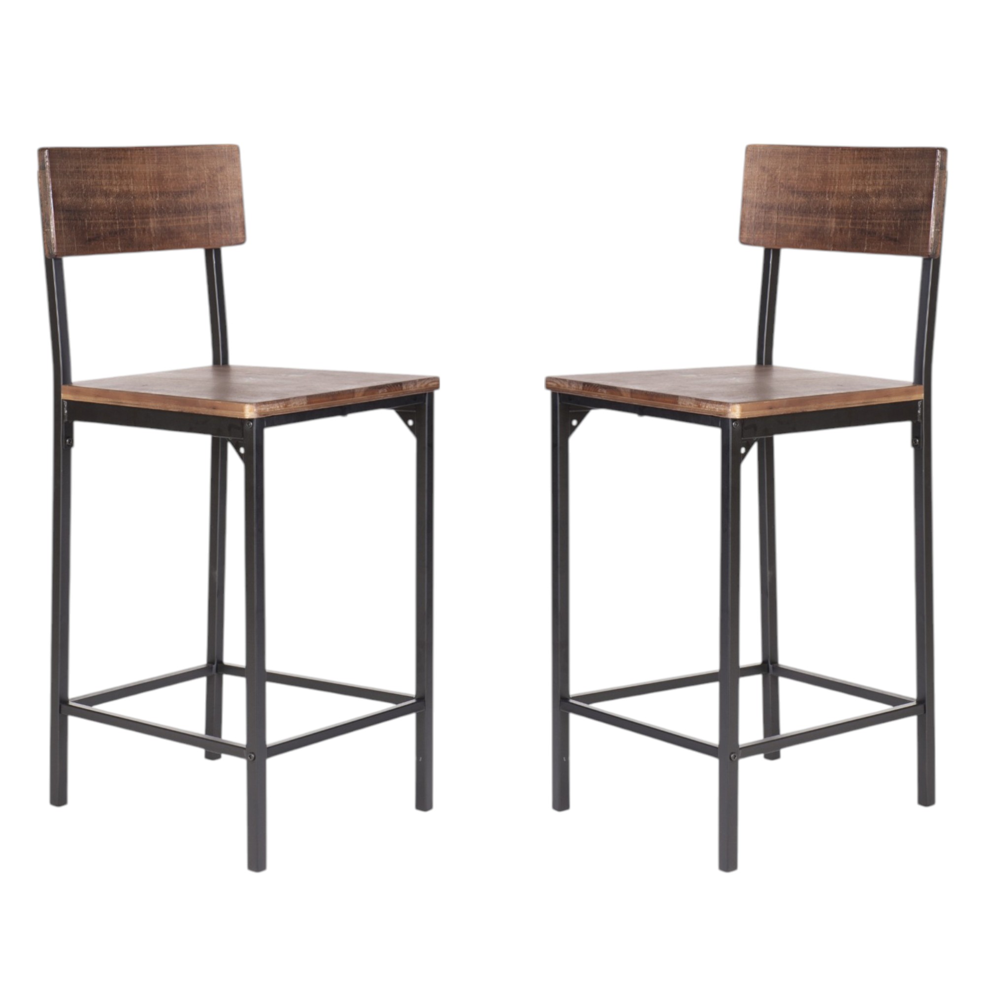 The perfect way to add some extra seating in your home, this set of two 25-inch brown and black solid wood and metal counter height bar chairs will elevate the look and vibe of your room. The black coloration of the high quality metal base marries nicely with the brown solid wood seat. Not only good looking and stylish, this chair features a rectangle shaped seat and a full_back for the ultimate in comfort and enjoyment. Designed with a footrest for comfort and convenience. 36-inch h x 15-inch w x 14.5-inch d.