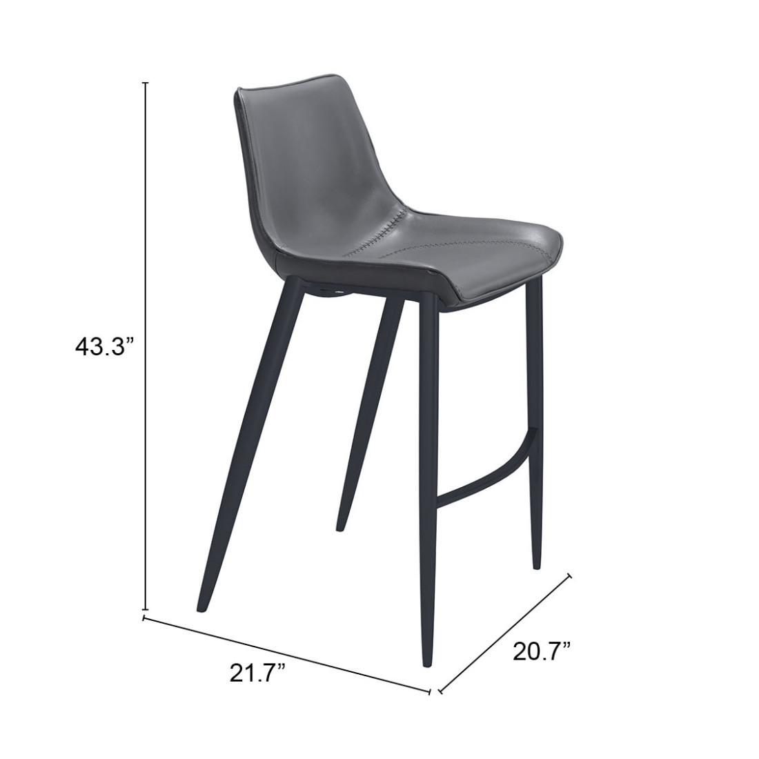 Comfort and design come together nicely in this set of two 30-inch dark gray and black faux leather and steel bar height bar chairs. The black coloration of the high quality steel base marries nicely with the dark gray faux leather seat. A full back mixed with a bucket shaped seat design makes this chair both comfortable and fashionable. Designed with a footrest for comfort and convenience. 43.3-inch H x 20.7-inch W x 21.7-inch D