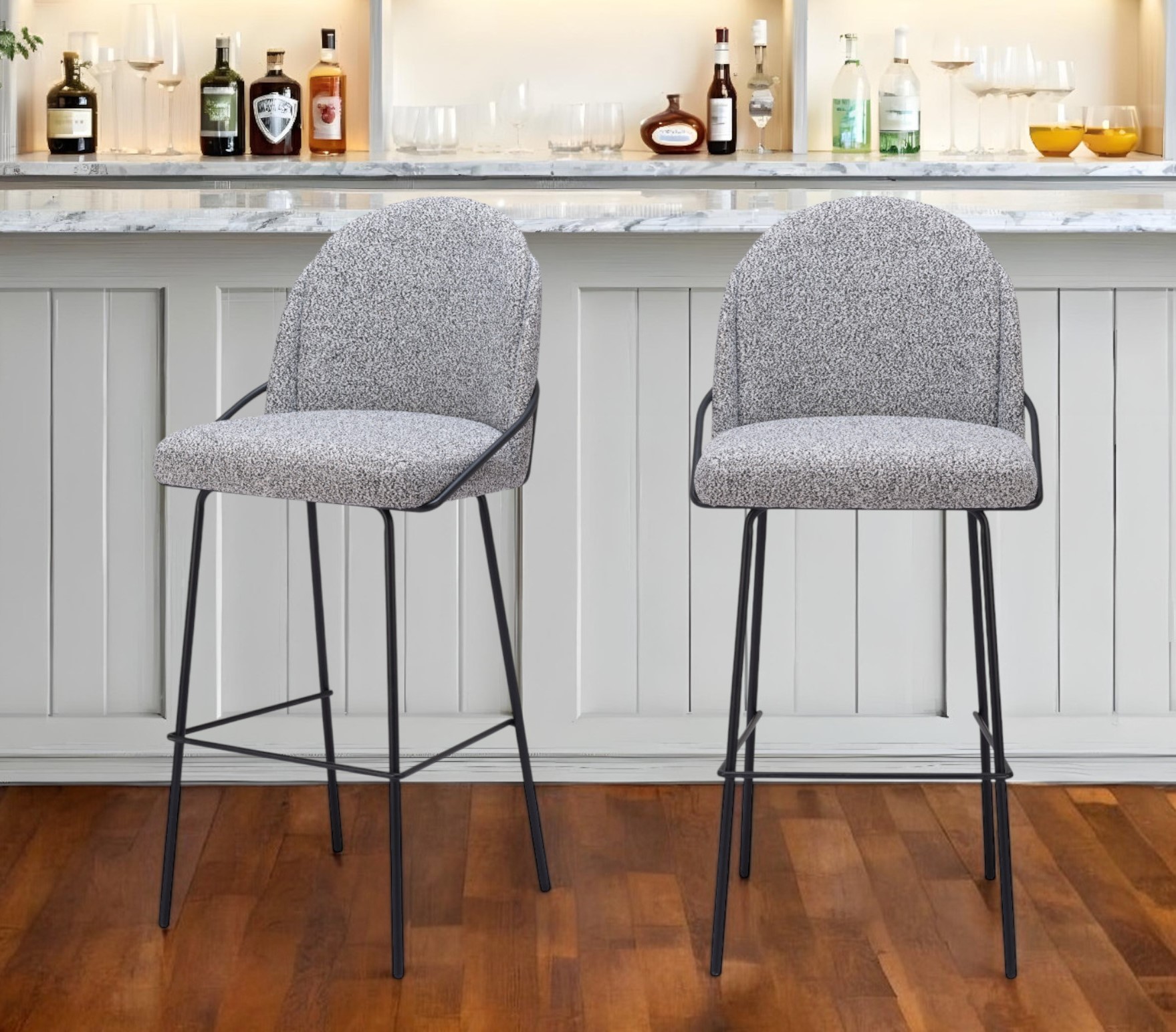 With this set of two 30-inch light gray and black shearling and steel bar height bar chairs you can add design and extra seating to your space. The light gray shearling seat of this stool is a nice contrast to the high quality, black steel of the base. The bucket shape of the seat combines with a full back to give this chair a comfortable and fashionable look. Designed with a footrest for comfort and convenience. 42.9-inch H x 20.1-inch W x 21.3-inch D