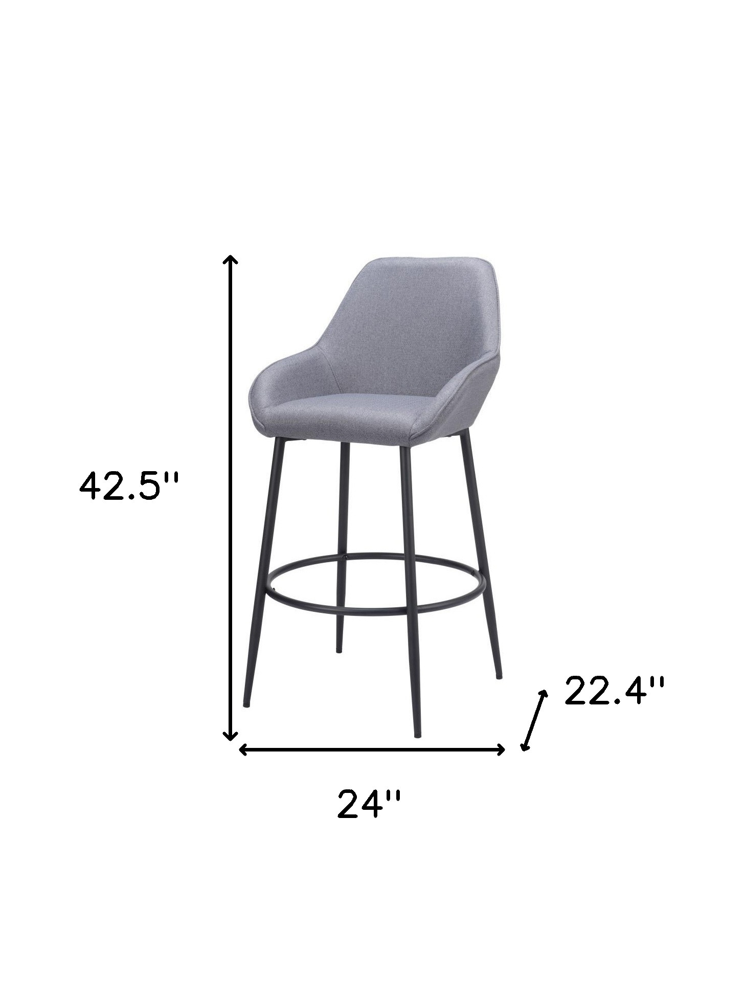 Bring a trendy bar vibe to your space, with this set of two 30-inch gray and black fabric and steel bar height bar chairs. Quality construction from black steel combines with gray fabric to give this stool a fresh and updated look. Not only good looking and stylish, this chair features a bucket shaped seat and a full back for the ultimate in comfort and enjoyment. Designed with armrests for your comfort, this chair also features a footrest for comfort and convenience. 42.5-inch H x 22.4-inch W x 24-inch D