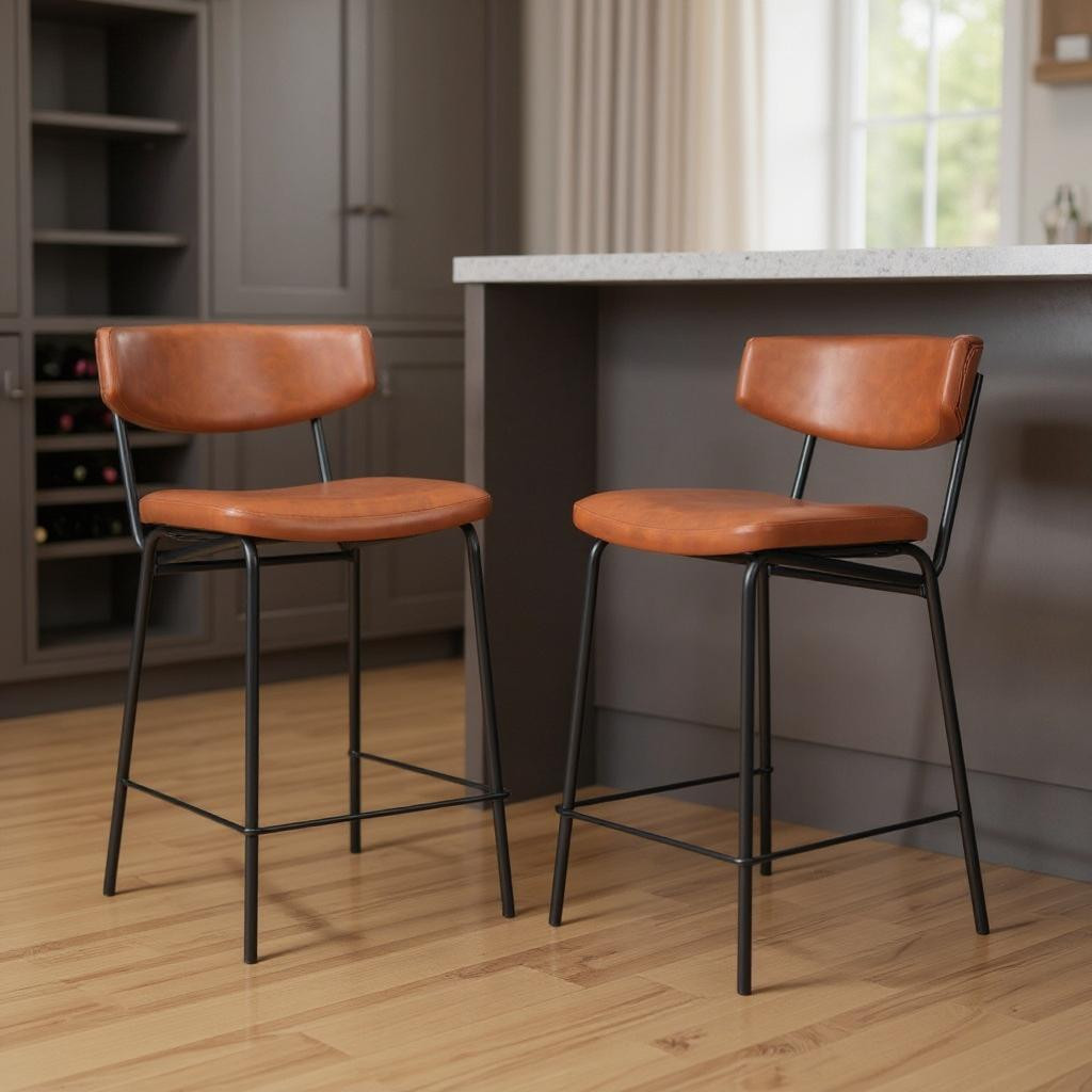 The perfect way to add some extra seating in your home, this set of two 30-inch brown and black faux leather and steel low back bar height bar chairs will elevate the look and vibe of your room. Quality construction from black steel combines with brown upholstered to give this stool a fresh and updated look. A low back mixed with a bucket shaped seat design makes this chair both comfortable and fashionable. 36.20-inch h x 18.50-inch w x 22.40-inch d.