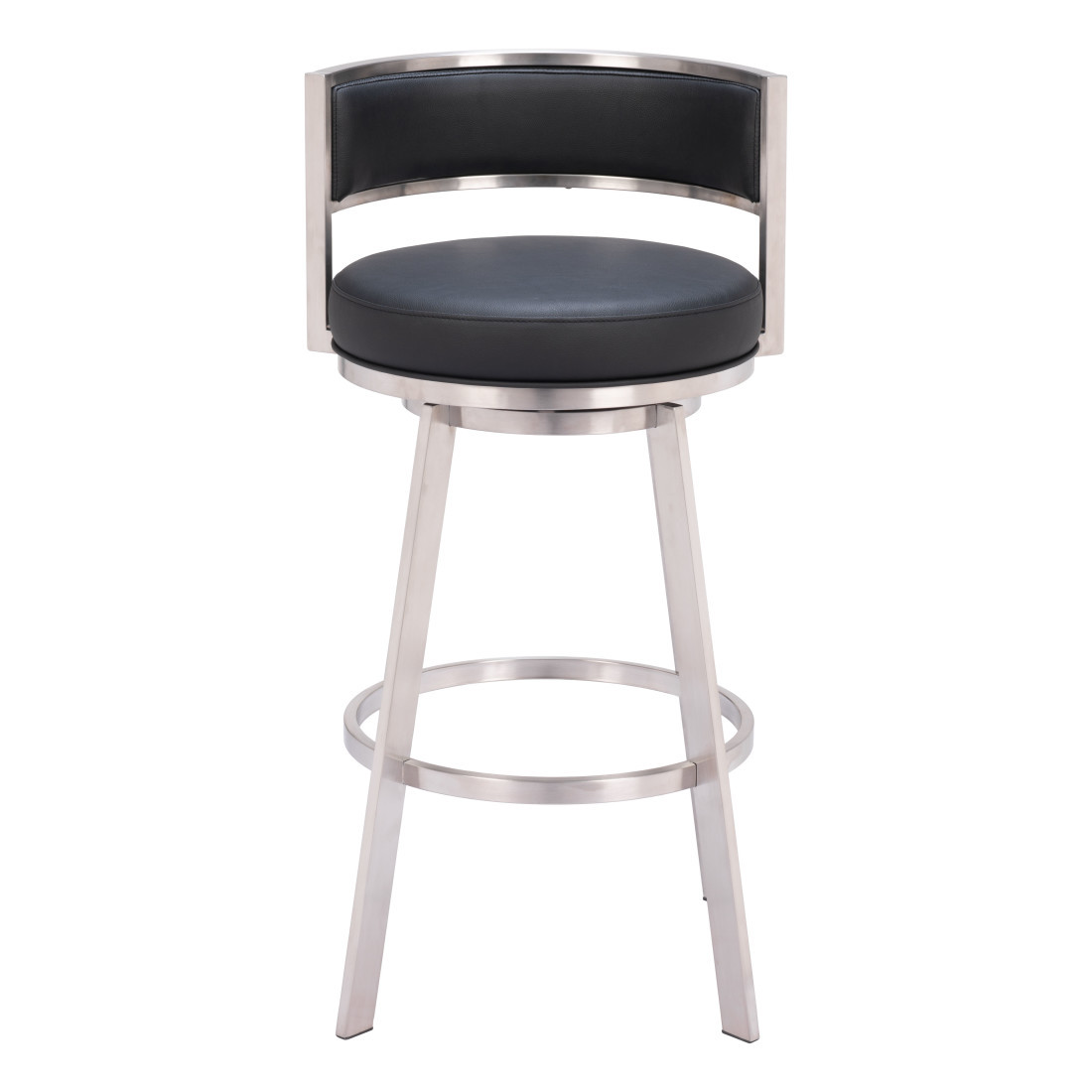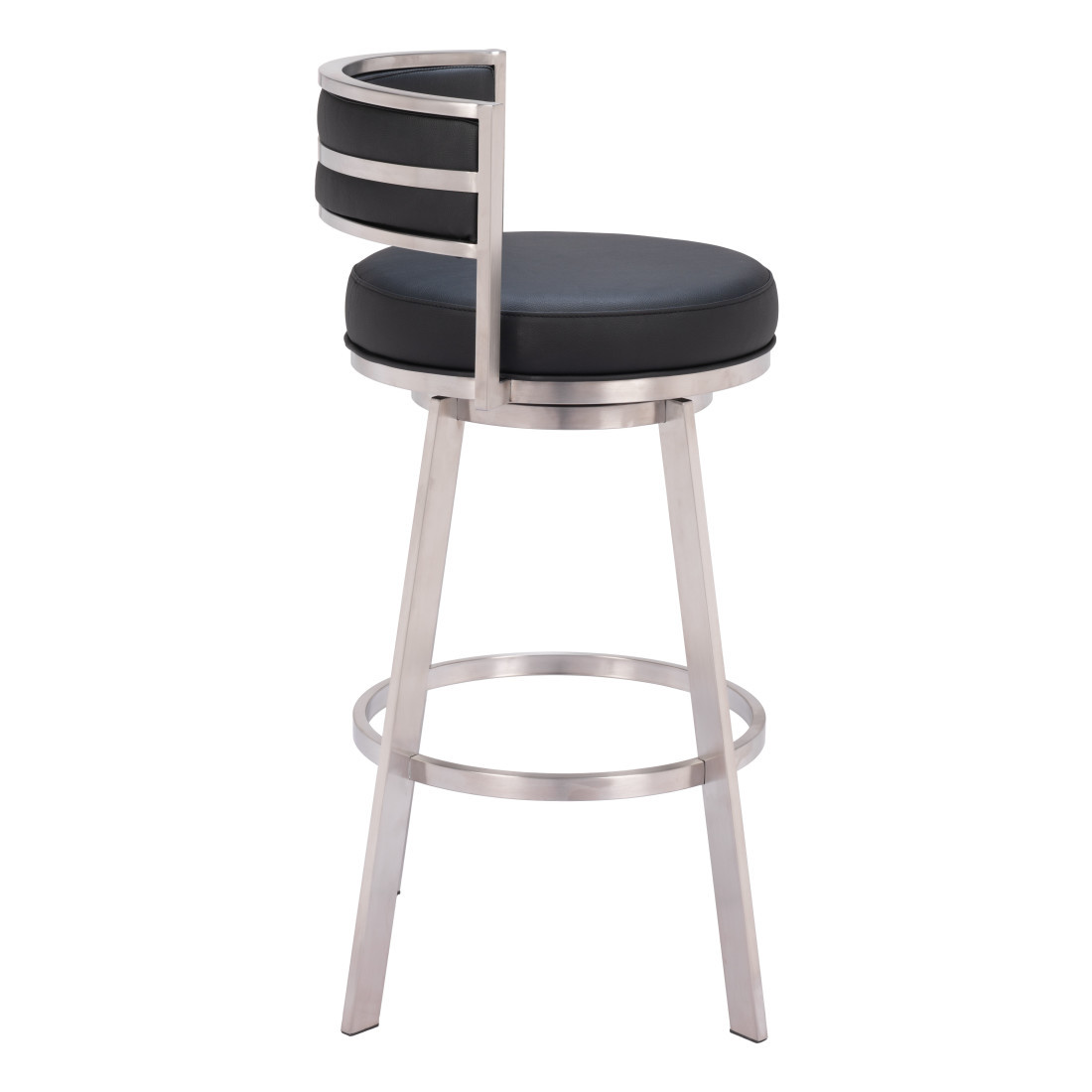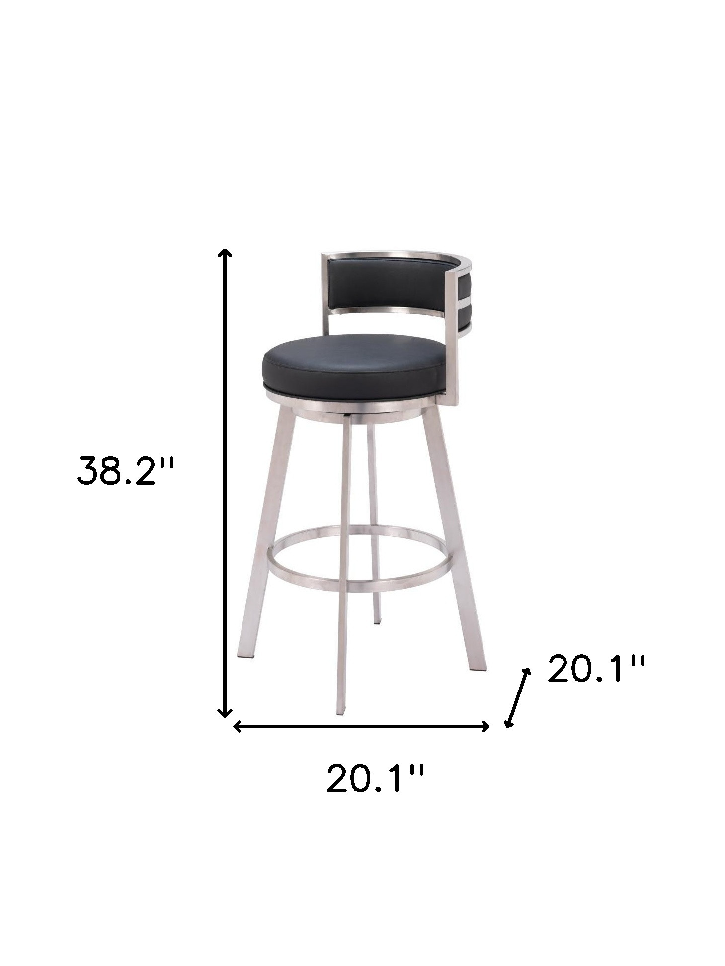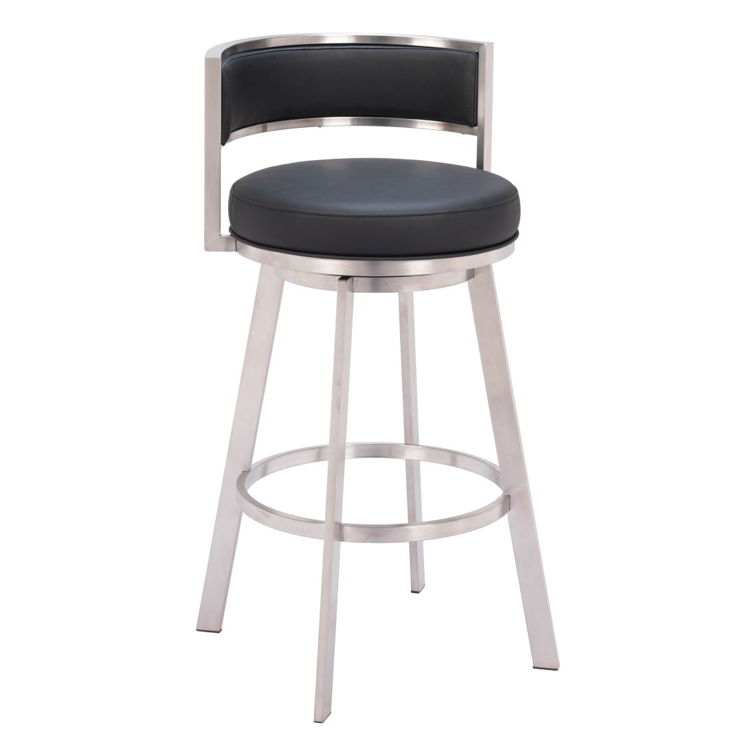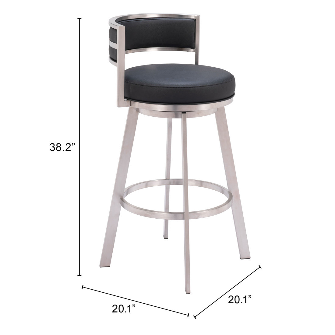 With this 31-inch black and silver faux leather and stainless steel low back bar height swivel bar chair you can add design and extra seating to your space. The silver coloration of the high quality stainless steel base marries nicely with the black faux leather seat. Not only good looking and stylish, this chair features a bucket shaped seat and a low back for the ultimate in comfort and enjoyment. Designed with a footrest for comfort and convenience. 38.2-inch H x 20.1-inch W x 20.1-inch D