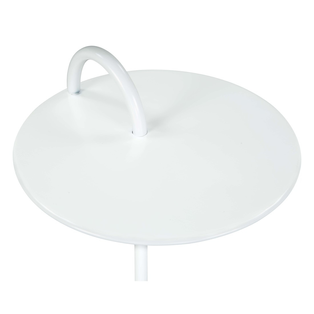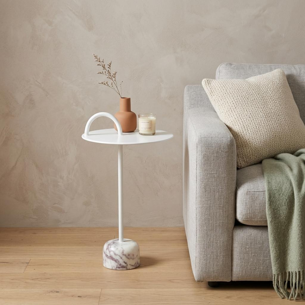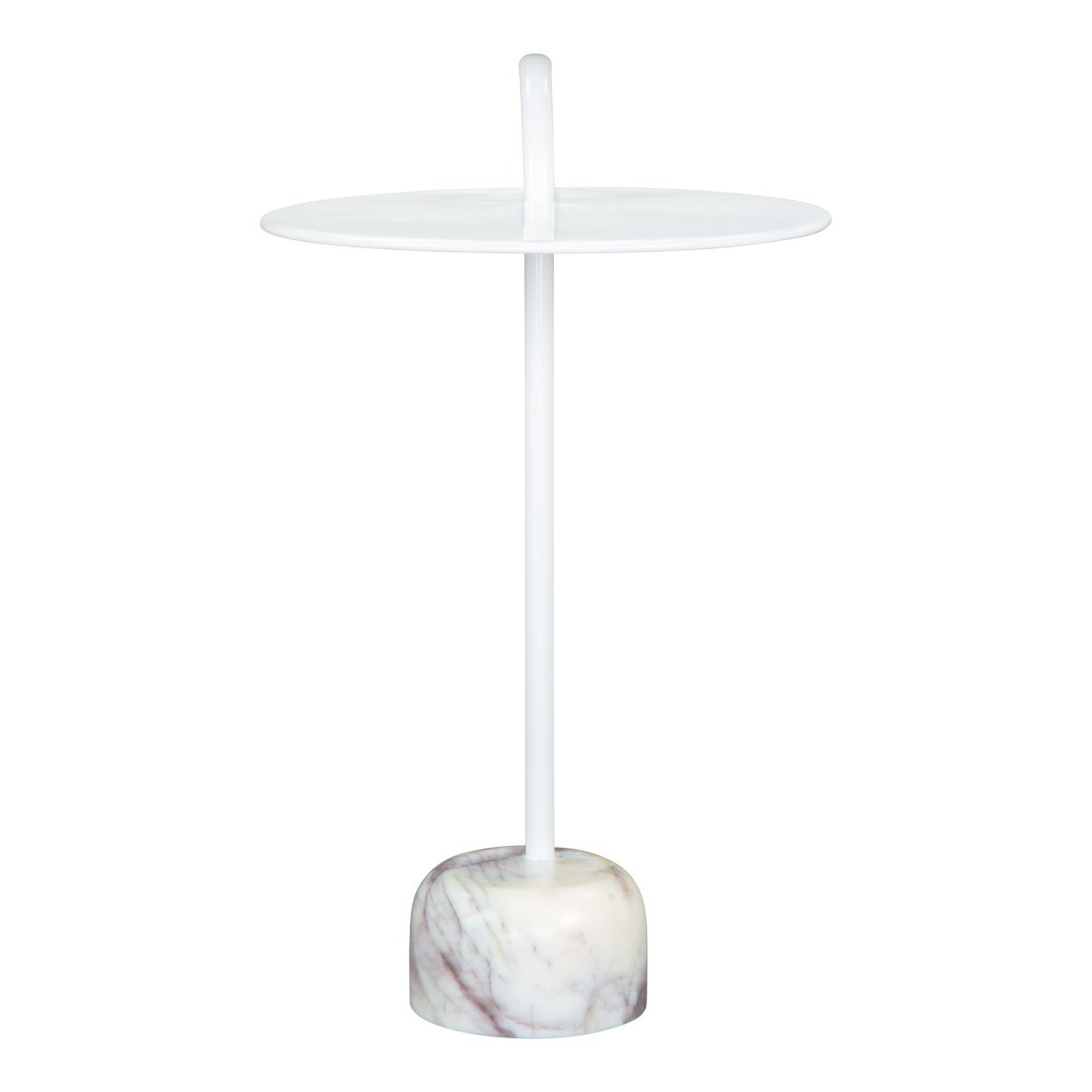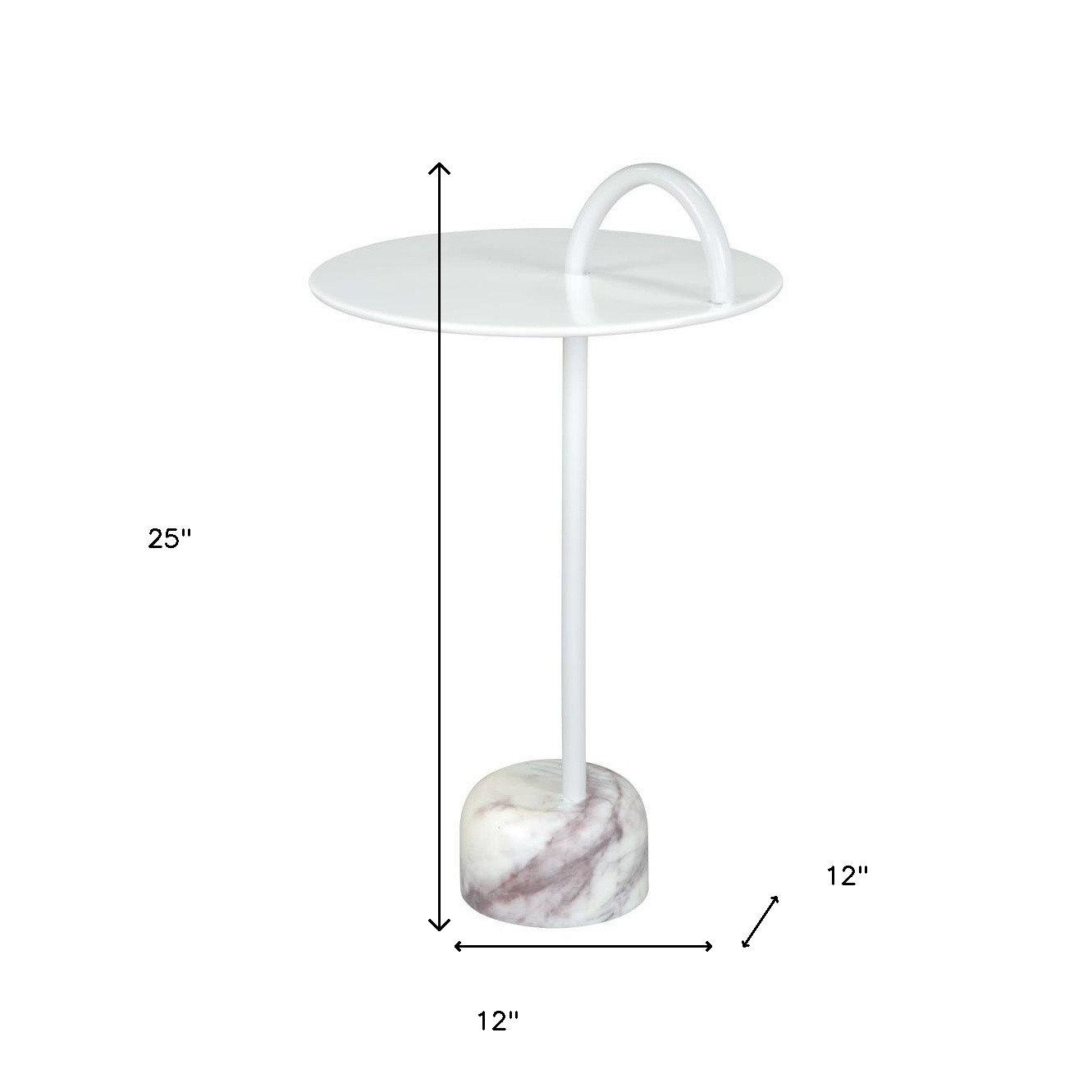 Distinctive in style the 25-inch white iron and marble round pedestal end table radiates a versatile charm. A sleek white monotone color gives this marble and iron table a fresh and updated look. Side tables are a great way to flank your sofa, use as an accent next to your favorite chair, or can even be used bedside. This versatile table is a great accent for most any room. 25-inch h x 12-inch w x 12-inch d.