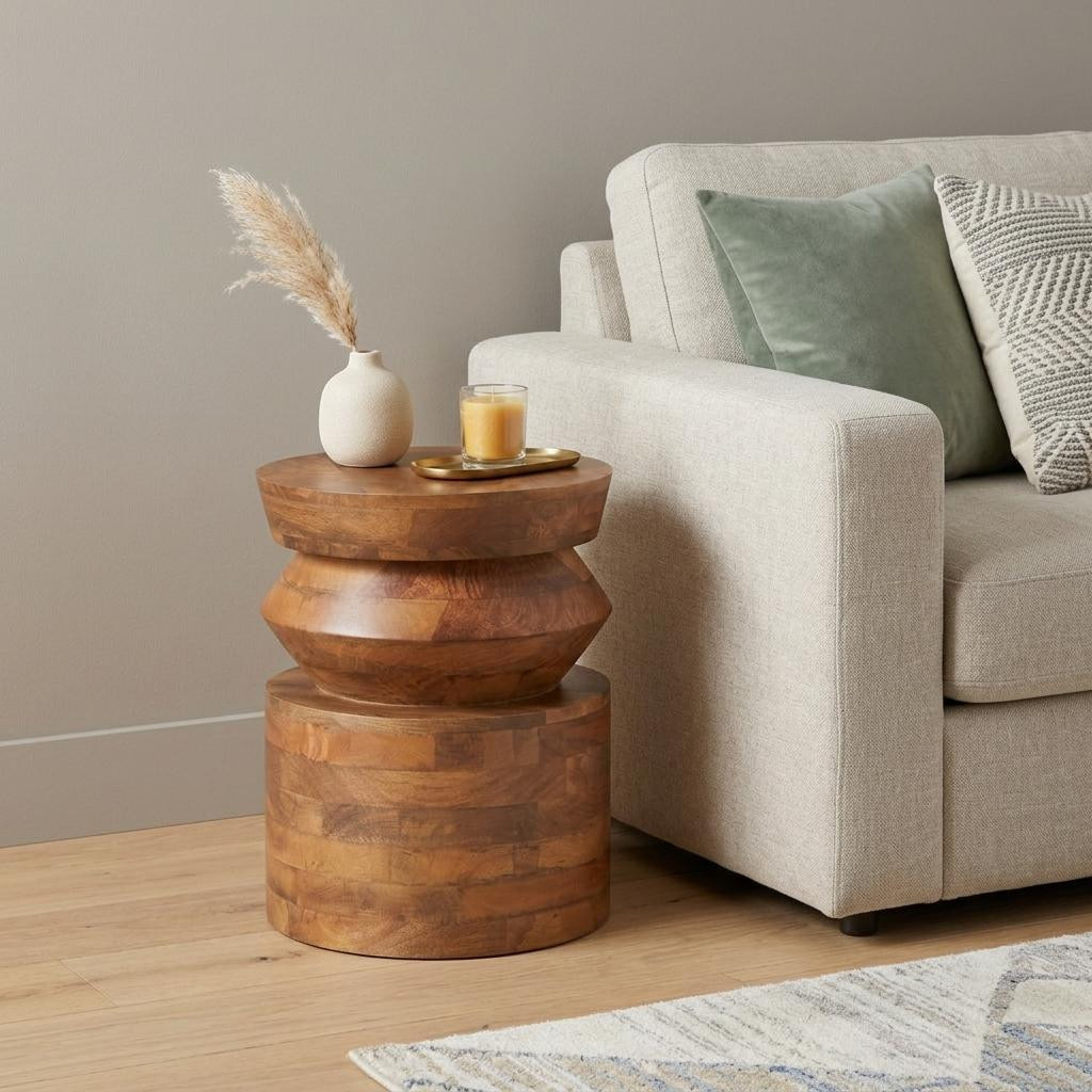 wood round pedestal end table, round pedestal end table, pedestal end table, solid wood round pedestal end, brown solid wood round pedestal |