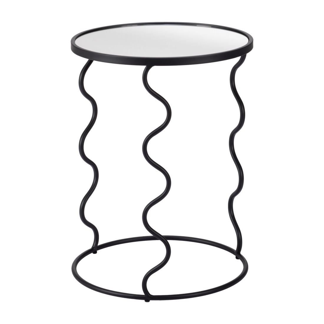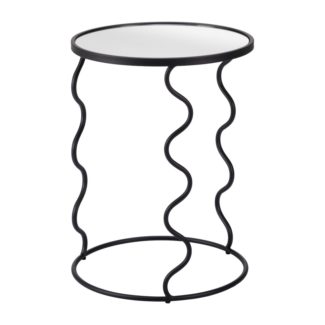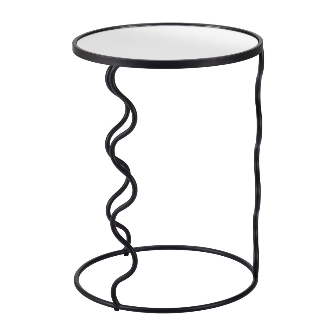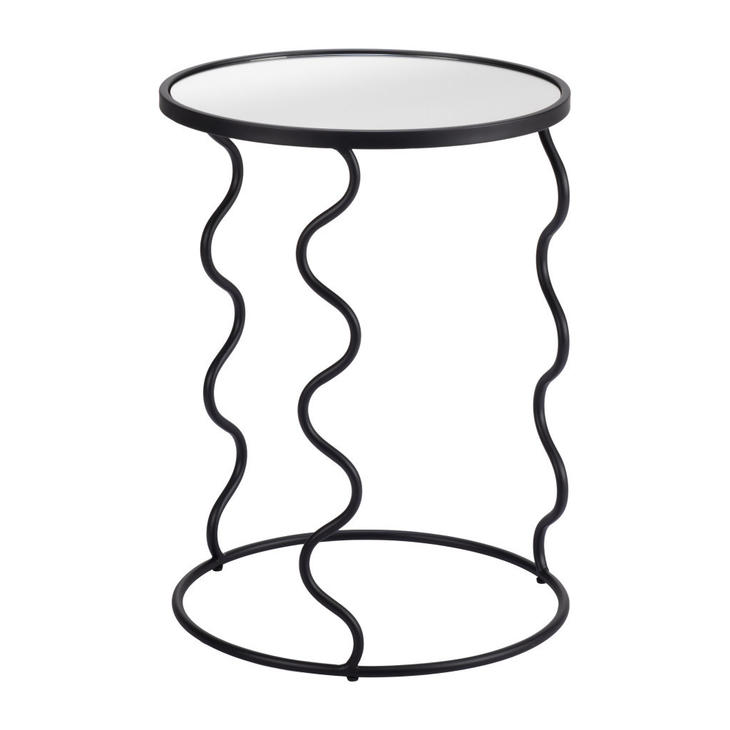 Distinctive in style the 24-inch black mirrored glass and steel round abstract end table radiates a versatile charm. A sleek black monotone color gives this steel and glass table a fresh and updated look. Reflective pieces of mirrored glass give this table a glamorous and unique look. An ideal location for placing your snacks and drinks, and a place to keep your lamp, frames, or other accessories. You can also use it as an entryway table to hold your keys. 24-inch h x 18-inch w x 18-inch d.