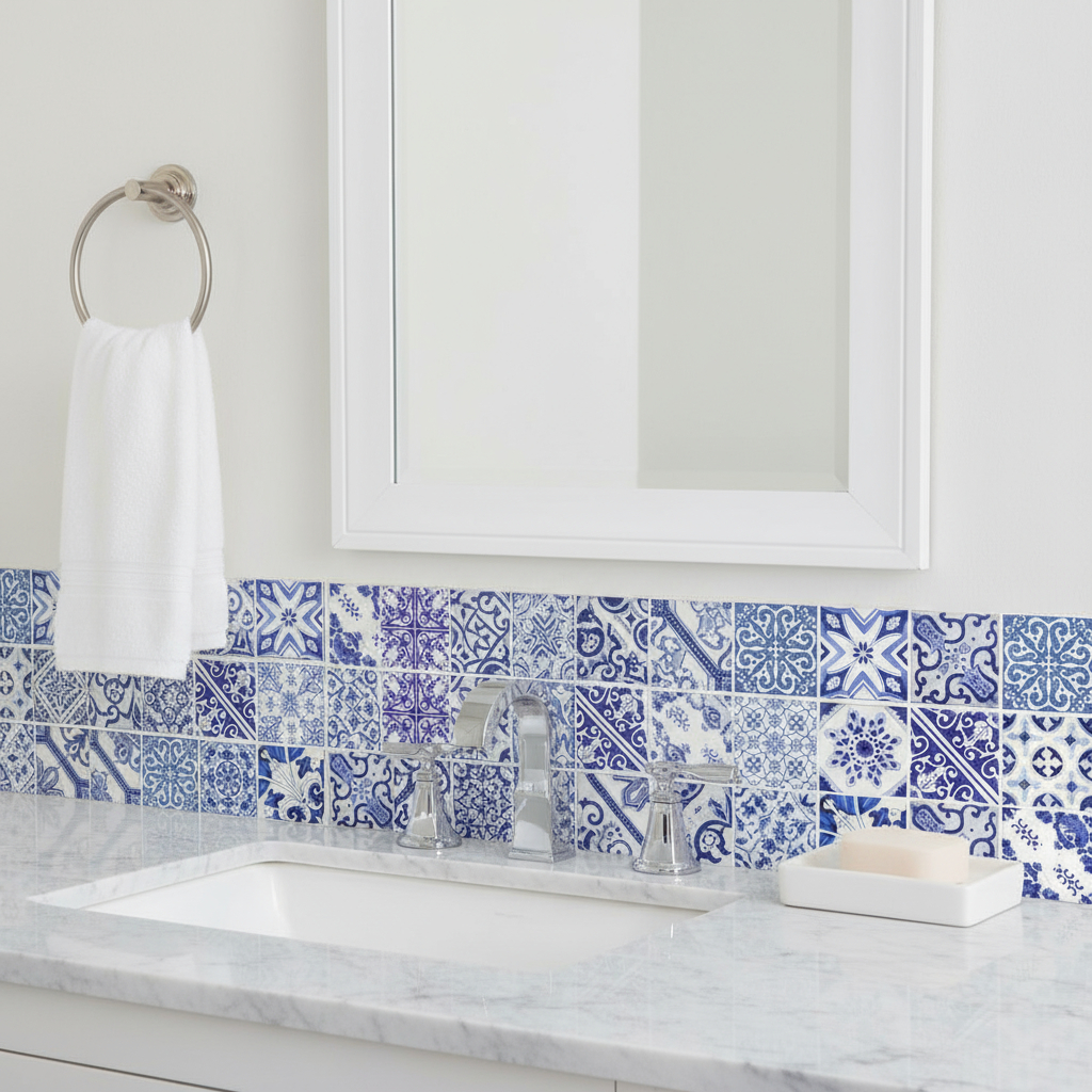 arabesque peel stick removable tiles, peel stick removable tiles, stick removable tiles, white vinyl arabesque peel stick, blue white vinyl arabesque peel |