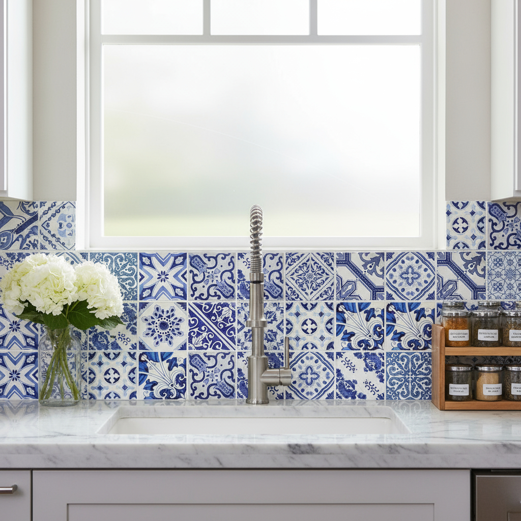 arabesque peel stick removable tiles, peel stick removable tiles, stick removable tiles, white vinyl arabesque peel stick, blue white vinyl arabesque peel |