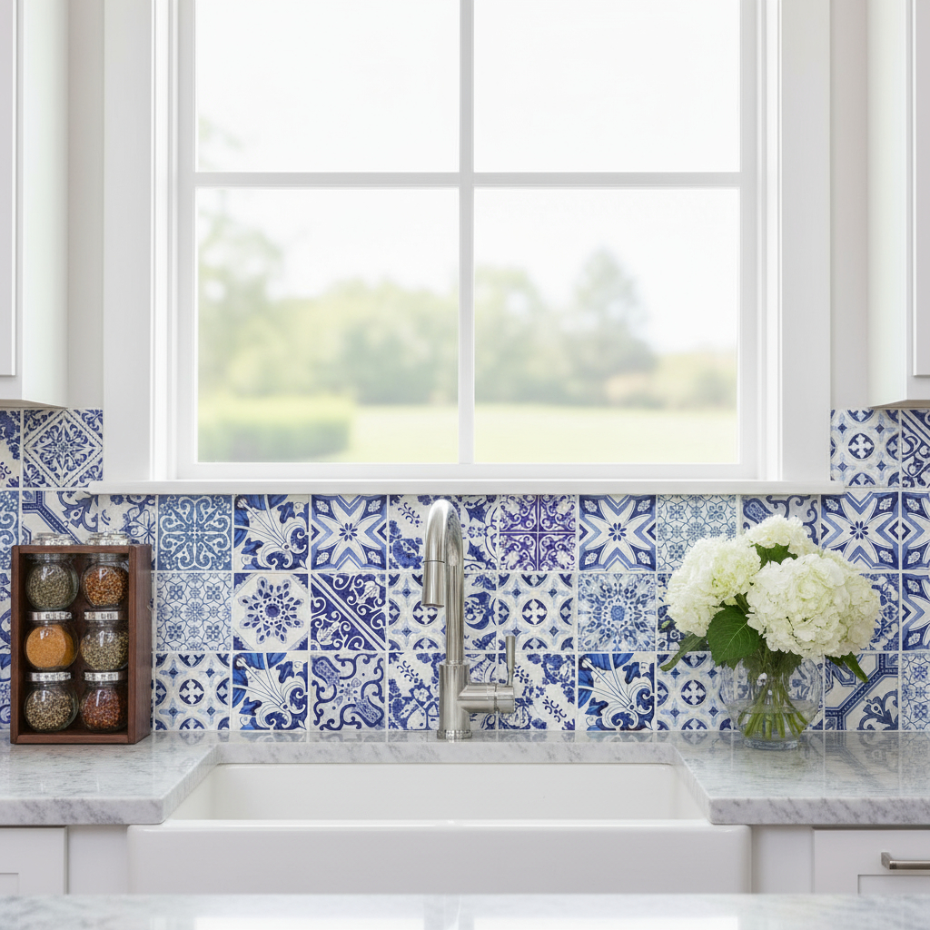 arabesque peel stick removable tiles, peel stick removable tiles, stick removable tiles, blue white vinyl arabesque peel, vinyl arabesque peel stick removable |