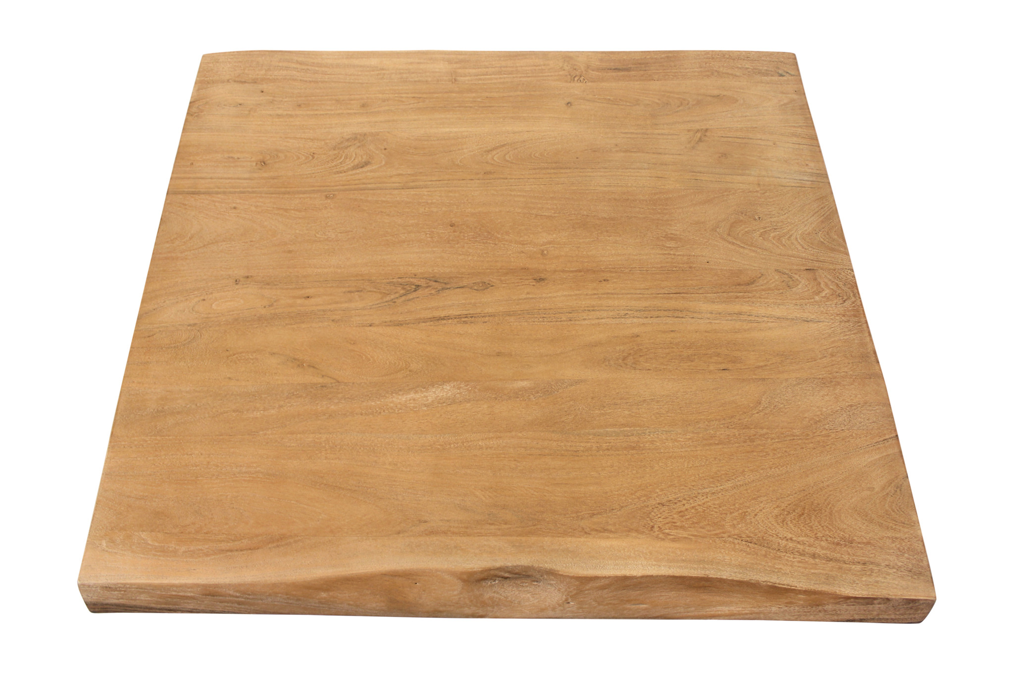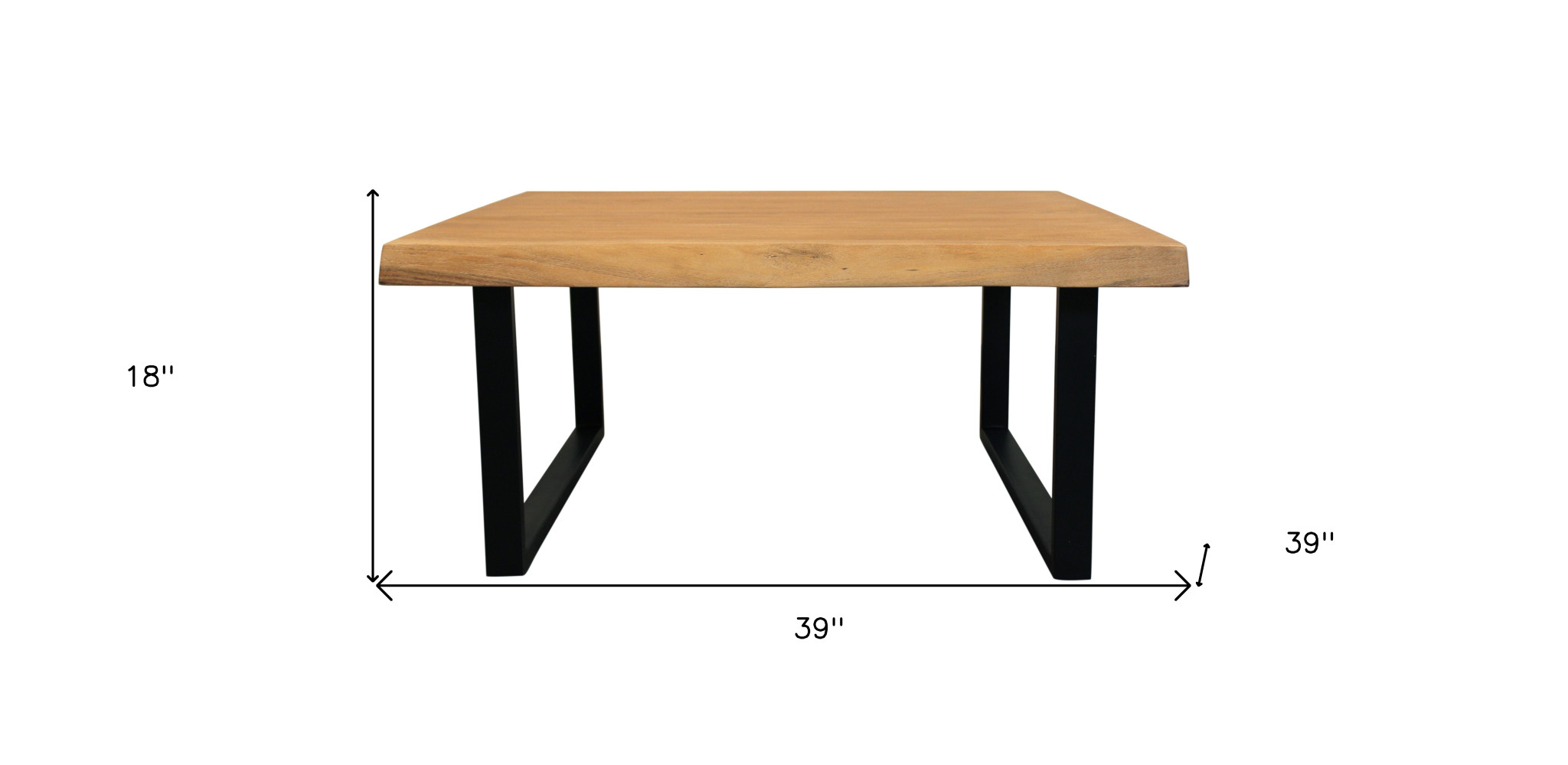 Add handsome, fashionable design to your living space with this 39-inch natural and black solid wood and iron square distressed coffee table. The black coloration of the high quality iron base marries nicely with the natural solid wood top surface. Complete with a purposefully distressed finish, this table has an aged, vintage, and rustic feel. This square table features a fresh and stylish shape to give your room a visually pleasing accent. It has an attractive design that will definitely breathe some fresh air into your interior. This coffee table is the sturdy, reliable and stylish answer to your living room needs. 18-inch h x 39-inch w x 39-inch d