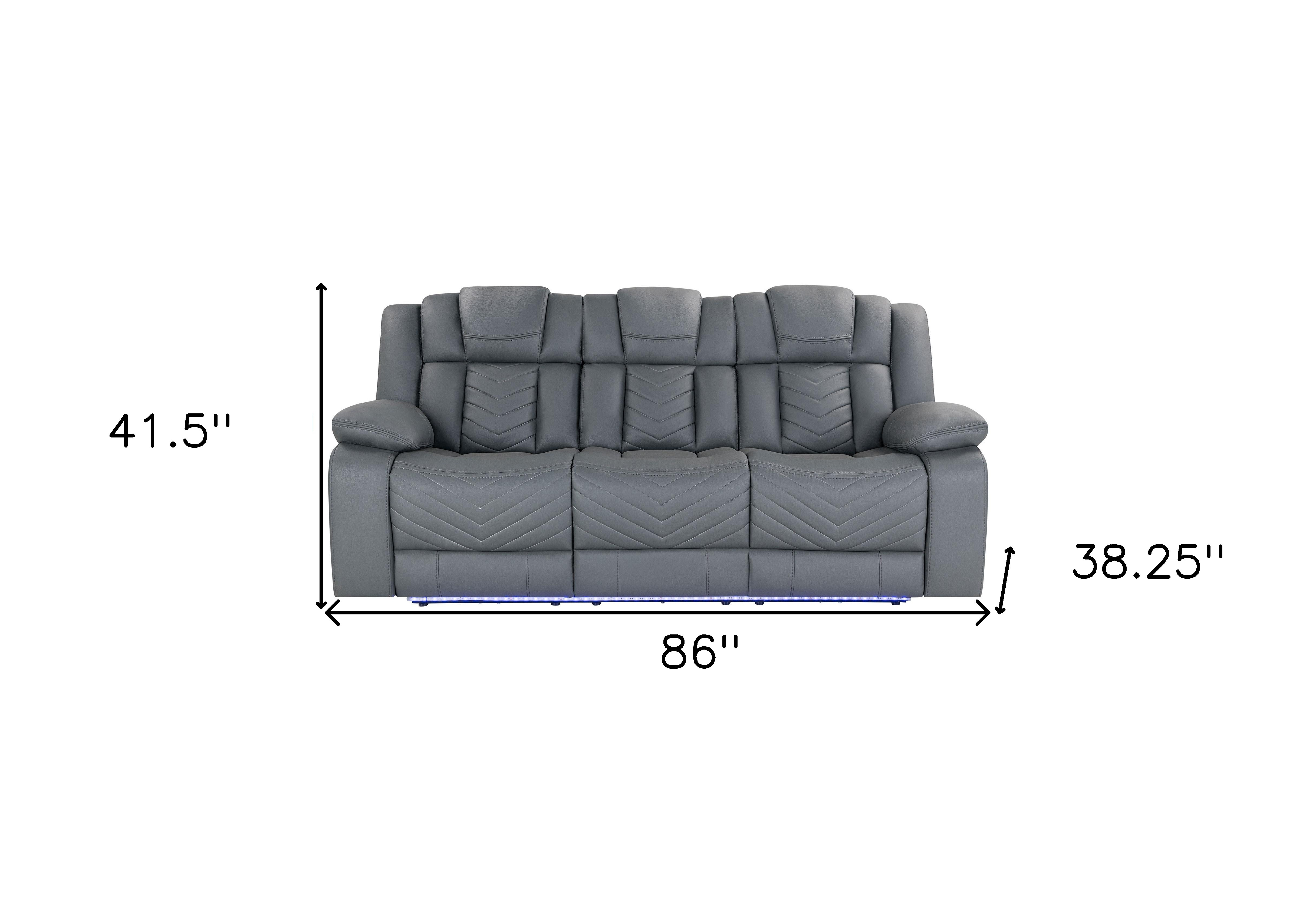 Designed for comfort and good looks, this 86-inch light gray fabric reclining usb sofa with toss pillow is a great option to anchor your space. Solid colors give you lots of decorative options and are easy to work into your decor scheme. Sinuous springs construction gives this piece strong support and makes it comfortable to sit even for long periods of time. Pillow top arms offer a comfy place to rest. Black metal legs effortlessly elevate the room and add a touch of contemporary design. A great showpiece for your room, this sofa is a must have. 41.50-inch h x 86.00-inch w x 38.25-inch d.